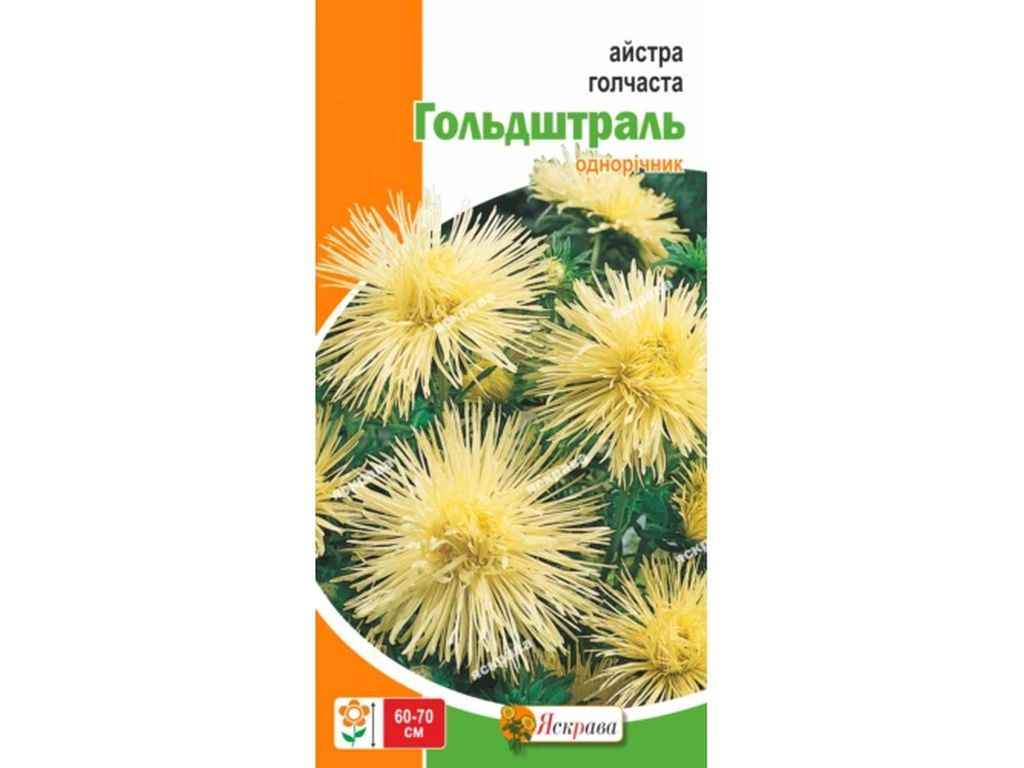 Айстра голчаста Гольдштраль-однорічна рослина.Кущ: компактний, заввишки до 60-70 см,квітка: ніжно-жовтого кольору, голчаста, до 12 см в діаметрі,квітне рясно протягом 40-45 днів.