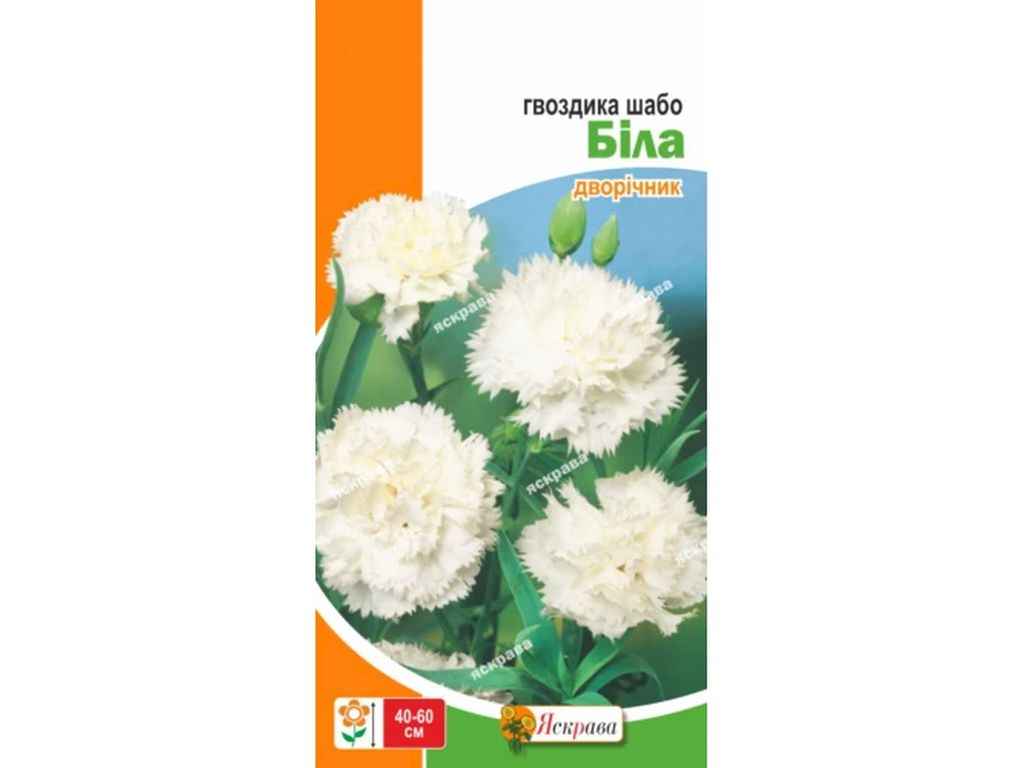 Гвоздика Шабо Біла-висота куща 30-50 см,квітка махрова, біла, до 7 см в діаметрі,цвітіння на другий рік, з червня по липень-серпень.В січні-лютому висівають насіння гвоздики Шабо в субстрат з додаванням торфу, піску, дерну і перегною на відстані 1 см один від одного, злегка присипавши прожареним піском.