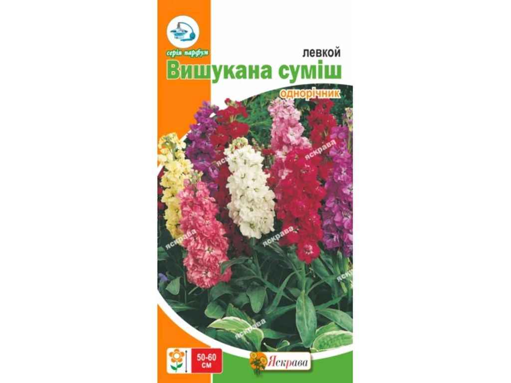 Левкой суміш -розсип витончених суцвіть з чарівним ароматом. Білі, червоні, фіолетові, золоті, рожеві квіточки.Кущ з прямими стеблами до 50-60 см,цвіте з червня по жовтень.Посадка левкою проводиться на розсаду в березні або у відкритий грунт в травні.