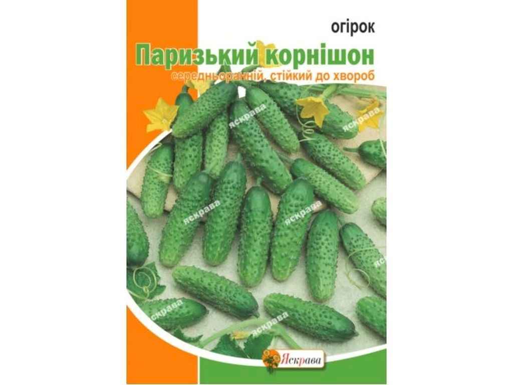 Огірок Паризький корнішон-універсальний ранньостиглий сорт.Терміни дозрівання—38-45 днів, на розсаду висівають в окремі місткості ще з квітня, в ґрунт переносять у фазі 2-3 листків, це прискорює терміни отримання врожаю на 2 тижні.
