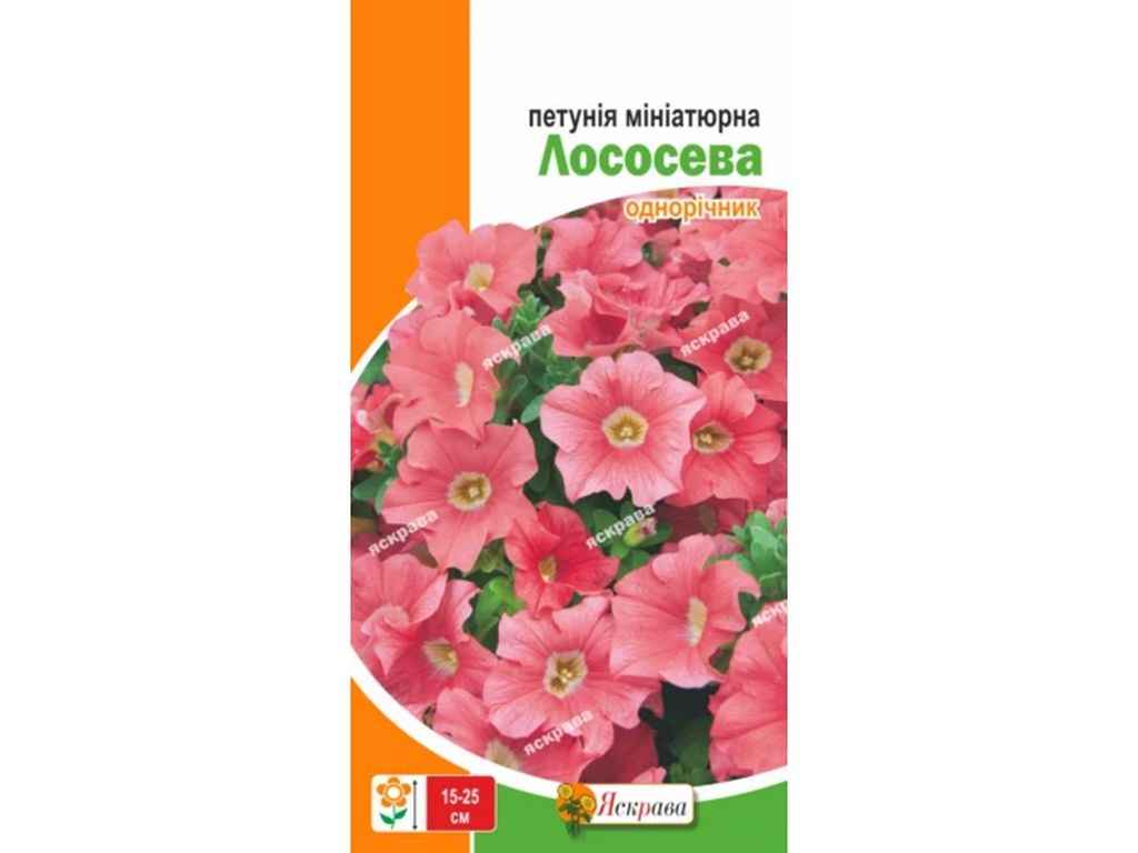 Петунія мініатюрна Лососева — ефектний і посухостійкий однорічник. Висота куща 15-25 см,цвіте з червня по жовтень,насіння дрібне, до 10000 штук в 1 грамі.Сіють на розсаду на початку-середині березня, розподіляючи насіння, змішані з піском, по поверхні та не присипаючи землею.