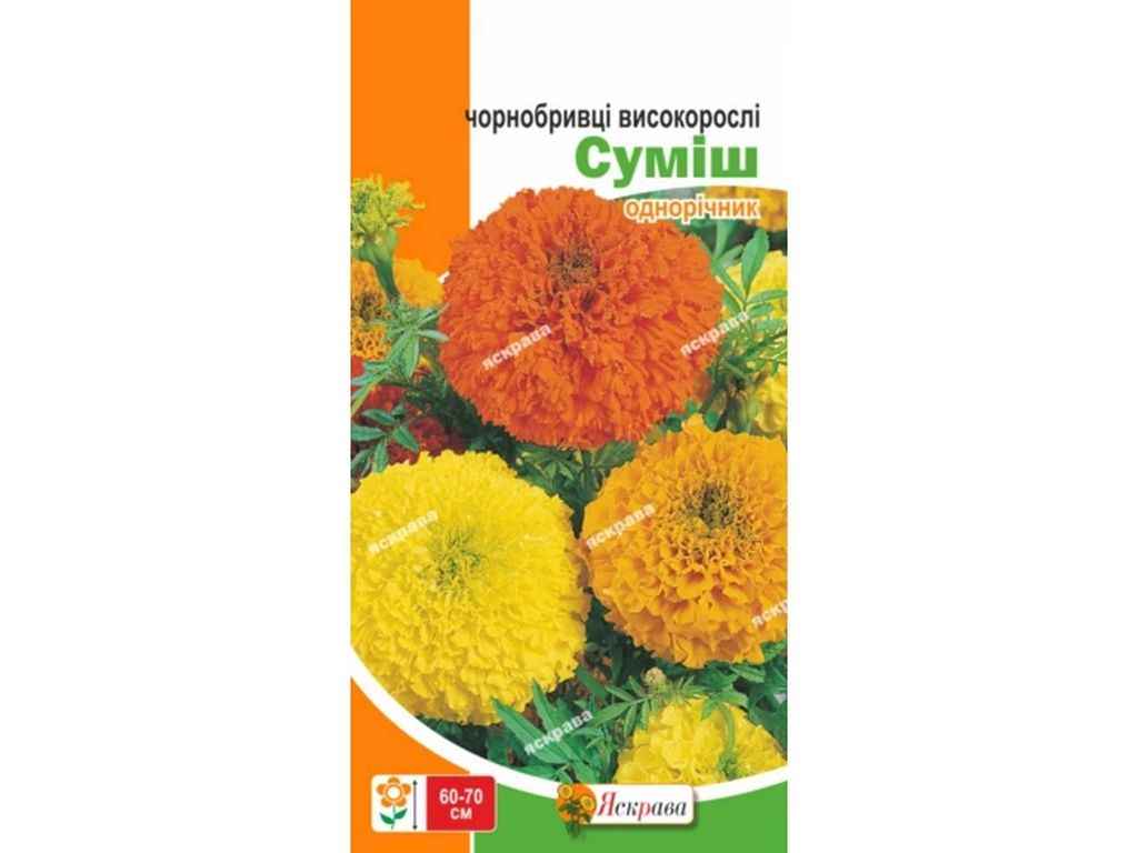 Чорнобривці високорослі суміш — яскрава палітра оранжевого, жовтого, червоного, білого забарвлення.Кущ: висота 80-100 см,цвітіння чорнобривців з липня до заморозків.Насіння на розсаду висівають у кінці березня-початку квітня на глибину 1-1,5 см, злегка присипавши землею.