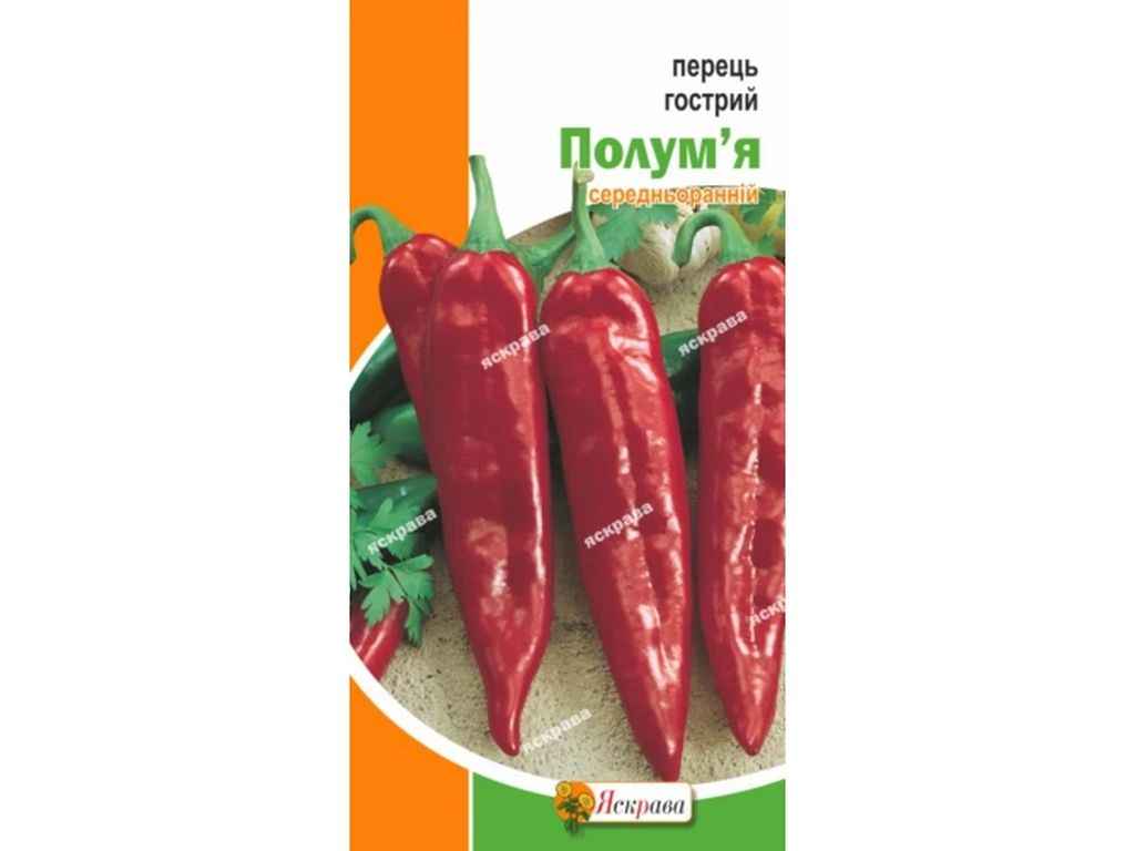 Перець гострий Полумя дозріває в середньоранні терміни, відмінно впорається не тільки з плодовою, але і декоративною роллю на вашій ділянці. Яскраво-червоні плоди гіркі з пряним ароматом, широко застосовуються в кулінарії для приготування гострих соусів і приправ, додається при засолюванні та консервуванні різних овочів. Кущ компактний, висотою близько 45 см,дозріває через 115 днів з моменту сходів насіння.Оптимальний термін для посіву насіння перцю - кінець лютого/ початок березня. Якщо посадку починати пізніше, то насіннєвий матеріал потрібно витримати в теплій воді, загорнути у вологу серветку, помістити в дуже тепле місце і проростити.