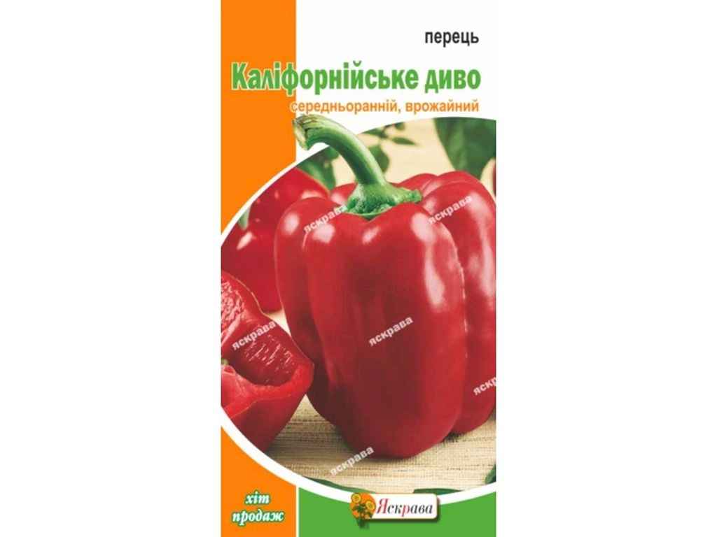 Перець Каліфорнійське диво - кущ потужний, з пружними пагонами, виростає понад 70 см,плоди чотирикамерні, з масою до 150 г,дозріває протягом 130 днів з моменту сходів,мякоть соковита, товщина стінки більше 6 мм,Насіння на розсаду висаджують у 2-й половині лютого з попереднім пророщуванням. Насіння витримують деякий час у воді, викладають на вологу серветку і поміщають у тепле місце. Оптимальна температура проростання насіння повинна бути від 20°C до 25°C. На 7-9 день насіннєвий матеріал можна сіяти в горщики з родючим і розпушеним ґрунтом.