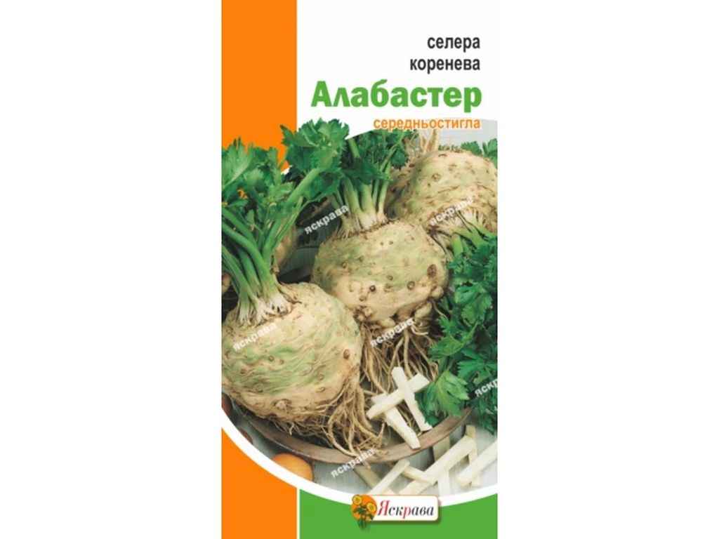Селера Алабастер-коренеплід ароматний,мякоть щільна, солодко-гірка,діаметр овоча 10-20 см,маса 200-400 г,вегетація 50 днів.Насіння перед посадкою замочують у воді або розчині стимулятора росту. Розкладають на вологій тканині й пророщують при 20 °C. Готують місткість з родючим субстратом. Посіви притрушують піском і ховають в тепло під парник. Сходи переміщують на світло при температурі 15 °C.