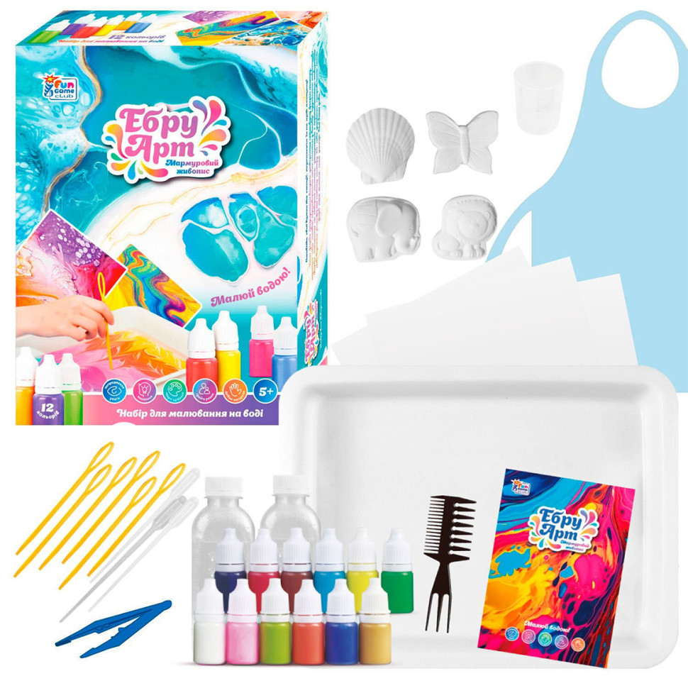 Набір для створення яскравих фігурок у техніці Ебру — це творчий комплект, який дозволяє дітям поєднати мистецтво мармурового малювання та декорування гіпсових фігурок. Фарби плавають на поверхні розчину, утворюють химерні візерунки, а дитина може легко перенести їх на фігурку чи папір. Такий процес захоплює, розвиває уяву, відчуття кольору та дрібну моторику.У комплект входить усе необхідне для яскравих експериментів:— 12 пігментованих фарб;— 4 гіпсові фігурки;— 2 набори акварельного паперу;— флакон з концентрованим розчином та порожній флакон;— ємність для малювання;— піпетка та мірна склянка;— пластикові стеки, пінцет і гребінець;— фартух;— детальна інструкція.Це чудовий набір для перших кроків у техніці Ебру та створення оригінальних робіт, які можна дарувати або зберігати як декор.