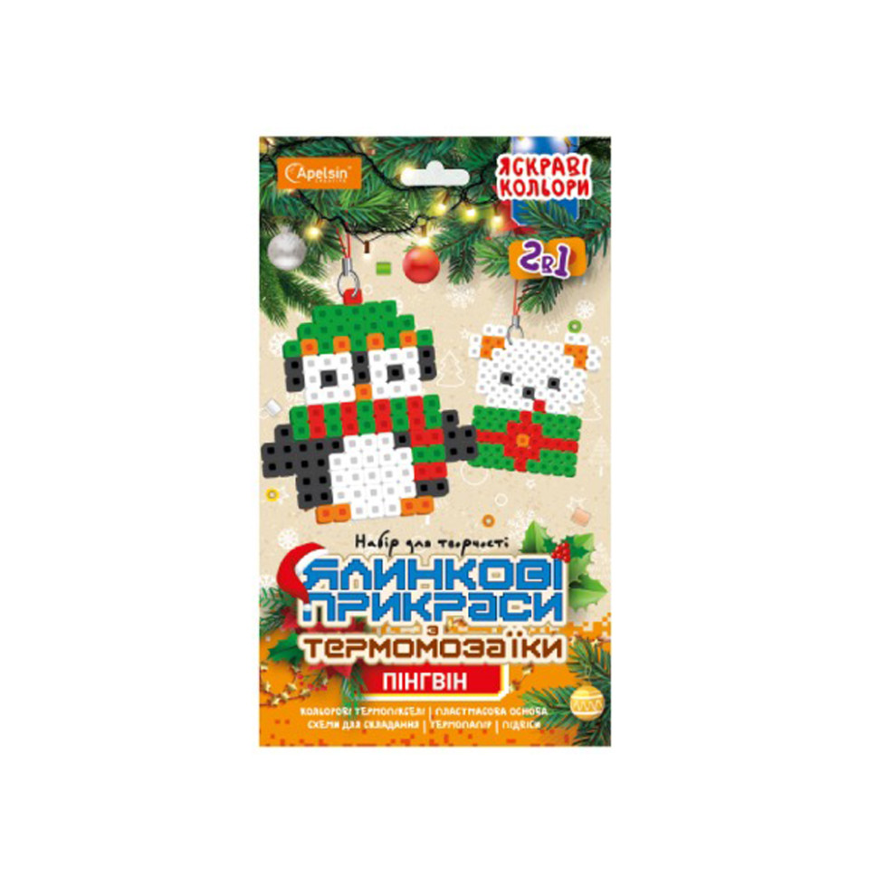 Набір для творчості ТМ "Apelsin CREATIVE" - це унікальна можливість створити дві чудові іграшки для новорічної ялинки.Розмісти схему під пластмасову основу.Виклади термопікселі за схемою.Накрий термопапером і проведи нагрівання за допомогою праски.Дай фігурці захолонути і обережно зніми з пластикової основи.Причепи підвіску.Ялинкова прикраса готова!Легко, весело та святково - ідеально підходить для спільного сімейного творчого процесу.Формат/розмір набору: 122×210×10 ммКомплектація:картонний підвіс - 1 шт.;кольорові термопікселі для двох прикрас;інструкція зі схемами для складання - 1 шт.;пластмасова основа - 1 шт.;термопапір - 1 шт.;підвіска - 2 шт.Набір запакований в пакет поліпропіленовий з картонною обкладинкою з європідвісом (офсетний друк, матова ламінація, вибірковий УФ-лак).Кількість термопікселів у наборі: 240-260 шт.