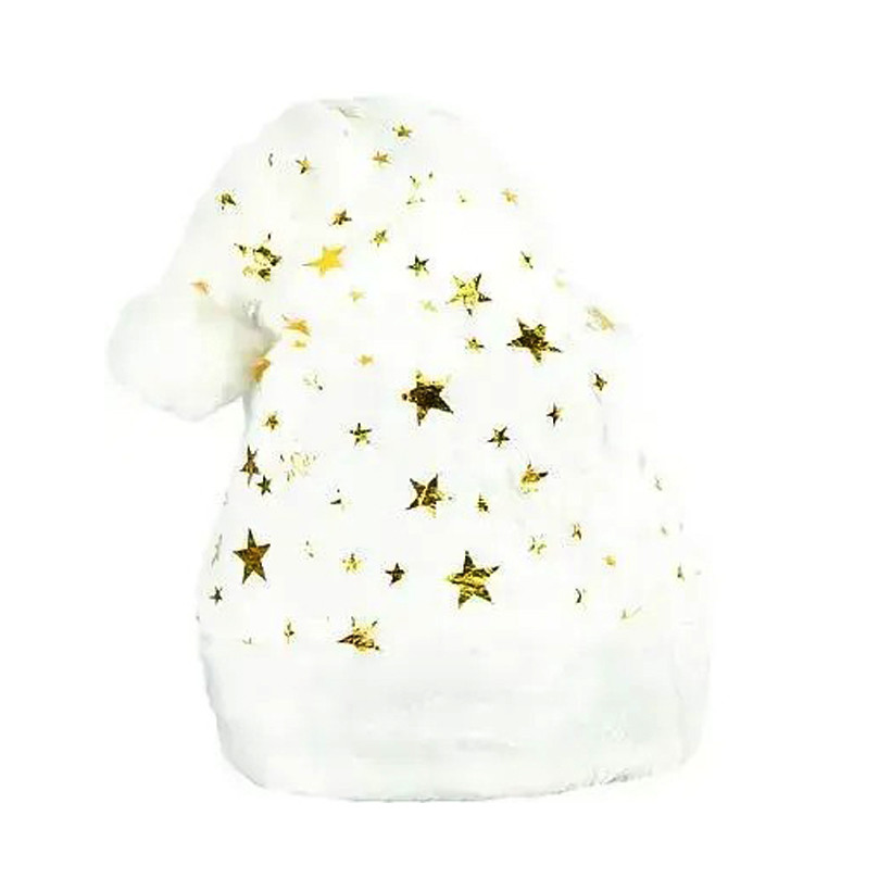 Блискуча шапка. Виготовлена з м'якого, приємного на дотик матеріалу з мерехтливим ефектом. Об'єм 56 см і висота 38 см забезпечують зручну посадку для дорослих і підлітків. Блискуча поверхня і пухнаста обробка роблять шапку яскравим святковим аксесуаром для корпоративів, ранок, фотосесій і новорічних заходів.