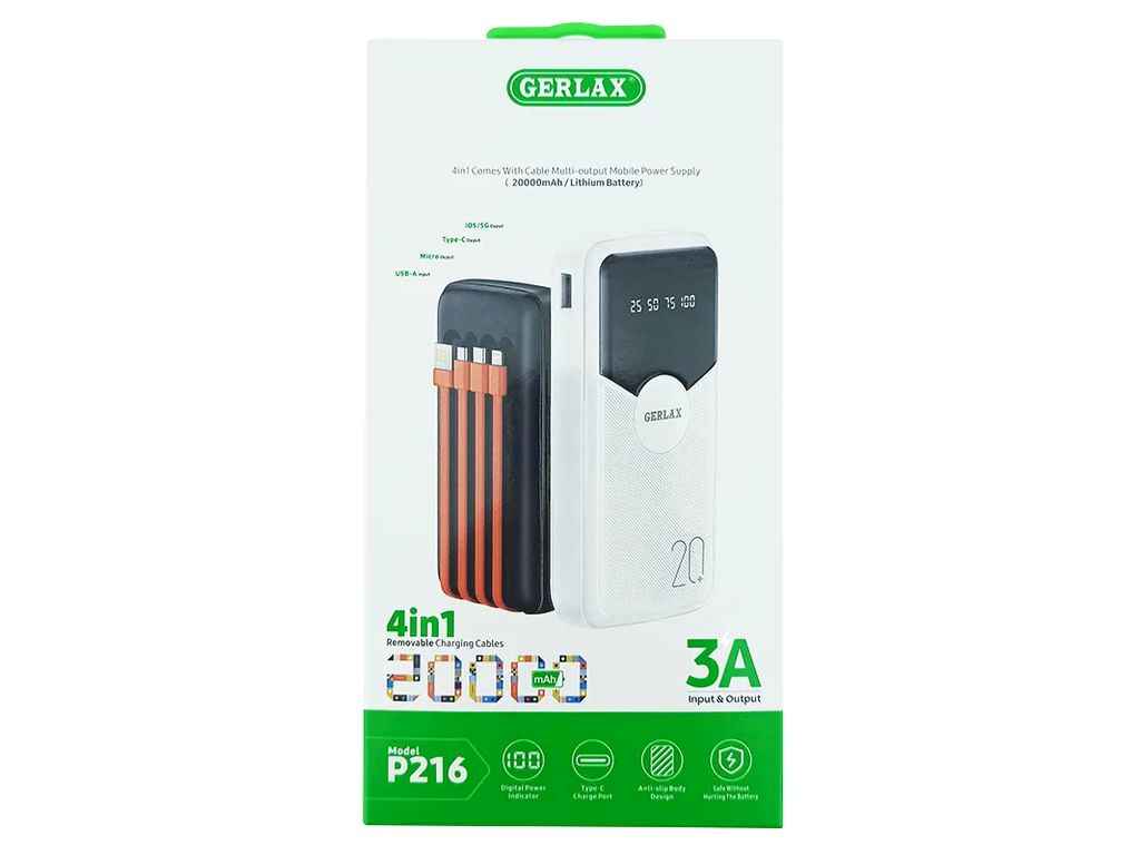 Power Bank 20000mAh P216 3A/1USB/LED дисплей/4 кабелі білий ТМ Gerlax