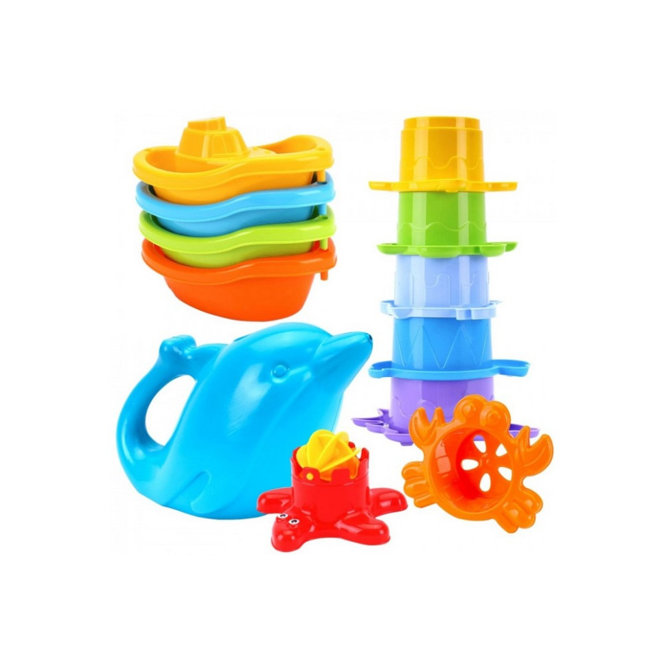 У наборі є все, щоб урізноманітнити водні ігри: великий дельфін-лійка для наливання води, кольорові формочки, які можна складати у пірамідку чи наповнювати водою, а також набір різнокольорових корабликів. Дитина зможе переливати воду, будувати, запускати кораблики та створювати власні ігрові сюжети.