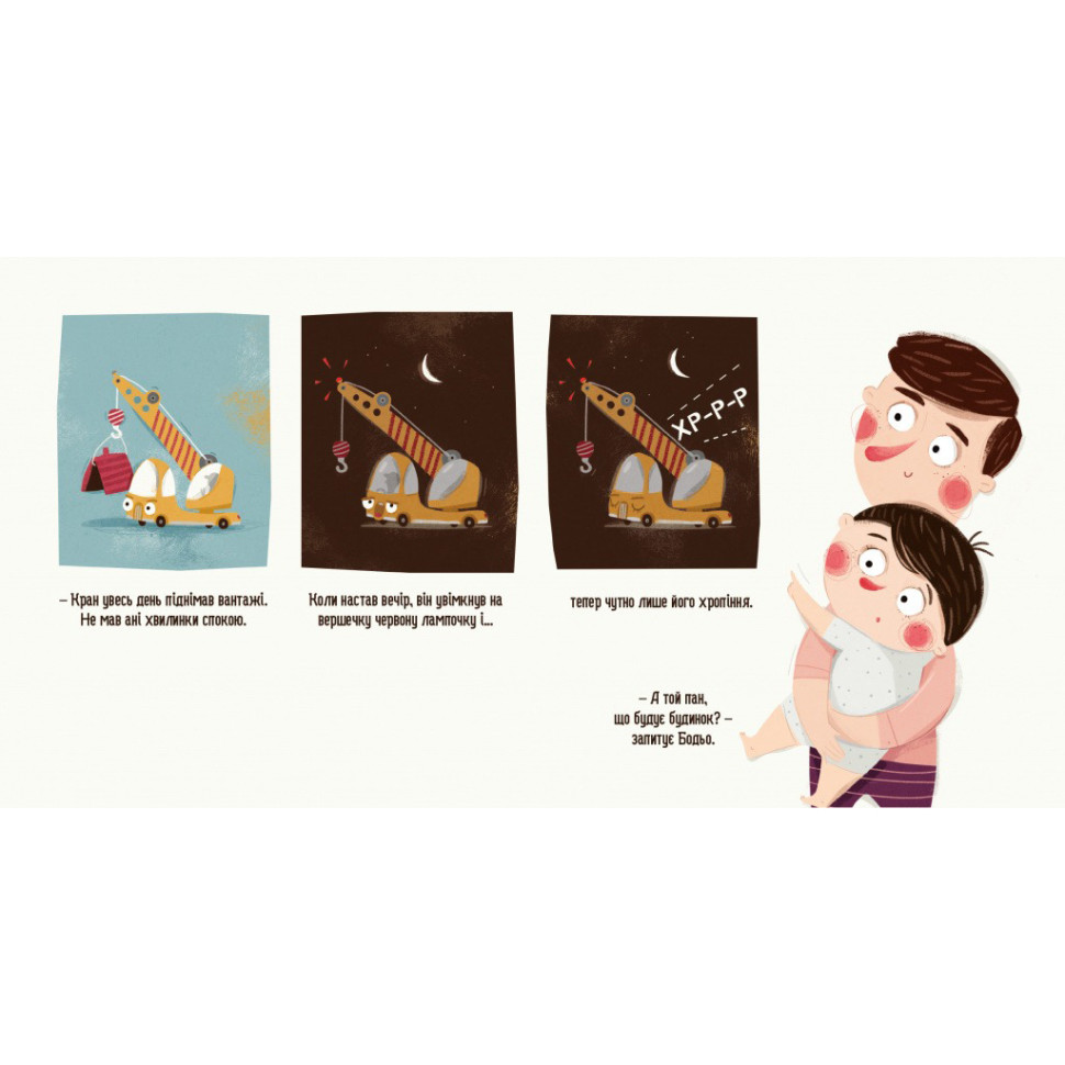 Бодьо хоче бавитися, але настає вечір i всi готуються до сну. Мися вже спить, тому треба поводитися тихо, щоб не розбудити її. А що роблять iншi? Кран увесь день пiднімав вантажі й тепер солодко хропе. Дерево та автівка, яка стоїть на паркінгу, теж вiдпочивають. Тітка, яка святкувала свій день народження, усміхається ввi снi. Ятка з морозивом зачинена, а лiтачок Бодя спокiйно лежить пiд лiжком. Ти теж вимикай світло й засинай: завтра на тебе чекає безліч нових пригод!