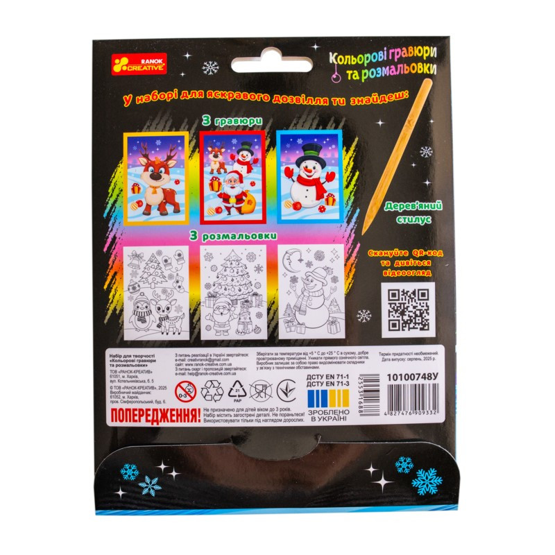 У комплекті 6 в 1: 3 яскраві кольорові гравюри та 3 чорно-білі розмальовки з казковими новорічними героями – оленятком, Святим Миколаєм, сніговичком, пінгвінчиком і котиком біля ялинки. До складу набору також входить якісний дерев’яний стилус, за допомогою якого можна вицарапувати картинки.