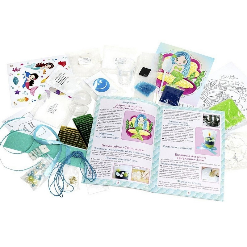 Створюємо 8 творчих поробок власноруч. Чудовий подарунок до свят. Запрошуємо тебе у світ натхнення і загадкових чарівних русалок. За допомогою цього набору діти зможуть самостійно зробити творчі поробки. А ще в цьому великому наборі для творчості є релакс-розмальовка і яскраві наліпки! У наборі є все необхідне для створення творчих поробок.Комплектація: стаканчик, кольоровий пісок (2 кольори), фітиль, намистинки, бісер, стрічка, шнур, флакончик-кулон, фетр, стрічка з паєток, голка, булавка, нитки, волосінь, сода, морська сіль, лимонна кислота, ароматизоване масло, блістерні форми для бомбочки, одноразові рукавички, пластикова ложка, харчовий барвник, блискуча мозаїка, магніт, картинка-основа, релакс-розмальовка, яскраві наліпки, детальна інструкція.Перелік поробок: гелева свічка, бомбочка для ванн, картинка-магніт з блискучою мозаїкою, релакс-розмальовка, флакончик-кулон, браслети дружби, яскраві наліпки, брошку з фетру.