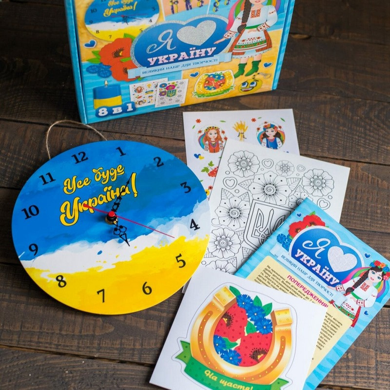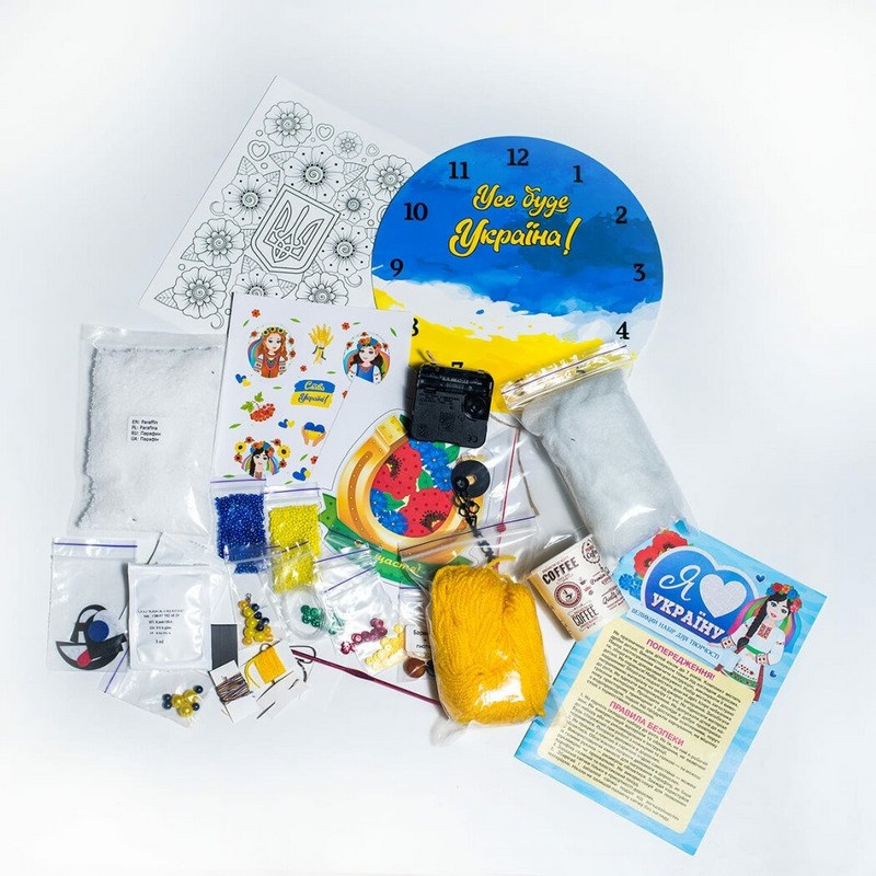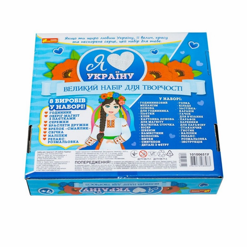 У наборі містяться усі необхідні складові для творчого процесуЯкщо ти любиш креативити й робити практичні та красиві речі в українському стилі, тобі сюди!Познайомся з цим ВЕЛИКИМ творчим боксом, завдяки якому можна створити аж 8 патріотичних виробів та аксесуарів! Усі необхідні складові до поробок ти знайдеш у цьому наборі. Кожен крок з виконання відтворений у кольоровій фотоінструкції. Готові вироби можна презентувати рідним чи друзям.Великий набір для творчості «Я люблю Україну» - це не лише патріотична підбірка по рукоділлю, а й чудова можливість навчитися різних технік хендмейду. Подаруйте його тим, хто любить створювати цікаві речі своїми руками й відкривати для себе щось нове!Час за творчістю поєднає усіх, перезавантажить дітей після навчання, а дорослих після роботи!Набір містить: годинниковий механізм, основу для годинника, паєтки, клей, картонну основу для магніту, магнітну стрічку, бісер, швензи, намистинки, волосінь, нитки, синтепон, деталі з фетру, голку, кільце, застібку-карабін, гачок для в’язання, парафін, барвники для парафіну, фітиль, наліпки, релакс-розмальовку, покрокову інструкцію.