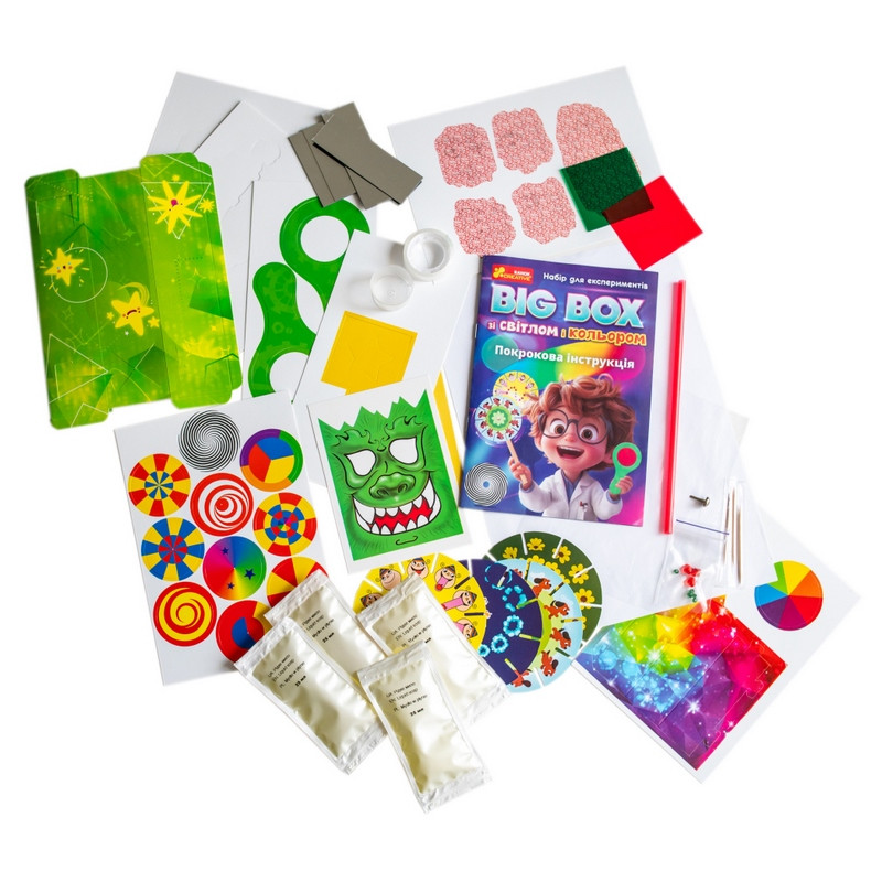 9 захопливих дослідів відкриють дітям світло й кольору у формі гри.Кожен експеримент унікальний: від створення калейдоскопа й перископа до «живих» картинок на фенакістископі та різнокольорових мильних бульбашок.Це не просто набір - це подорож у науку, де дитина вчиться спостерігати, досліджувати й робити власні відкриття. Всі матеріали вже всередині, тож залишиться лише зануритися в експерименти. Ідеальний подарунок для юних дослідників, який розвиває цікавість, творче мислення й любов до пізнання світу.Набір містить: картонні заготовки фігур, червоні картинки, білий папір, картонне обличчя монстра, картонний тримач, кольоровий пластик (червоний, зелений), прямокутні дзеркала, скотч, рідке мило, корпус калейдоскопа, заготовку перископа, картонний тримач для пластику, довгі дзеркала, різнокольорові скляні намистинки, мірний стаканчик, пластикову трубочку, харчову плівку, картинки для фенакістископу, картонні основи для дзиґи, дерев’яну паличку, покрокову інструкцію.