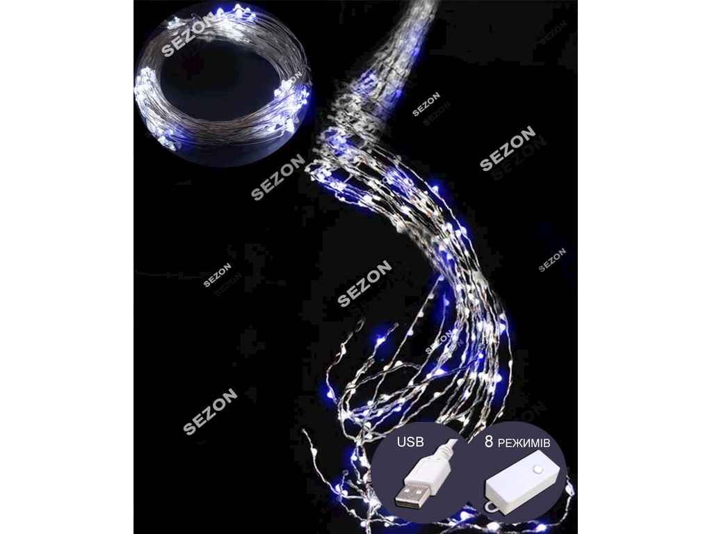 Гірлянда-пучок роса 300LED синьо-білий 2м 10 ліній8 режимівUSB ТМ КИТАЙ