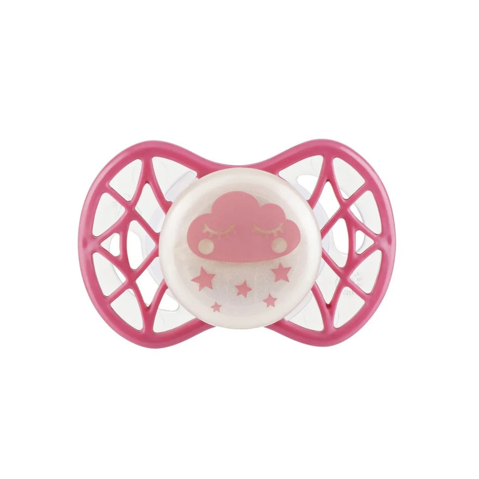 Ортодонтична пустушка Air55 Cool, яка світитися в темряві. Платівка соски на 55% складається з повітря забезпечуючи майже повну аерацію області навколо рота, уникаючи скупчення слини, яка може дратувати шкіру. Захисний ковпачок для соски для підтримки чистоти соски і стерилізації в мікрохвильовій печі простим додаванням води.