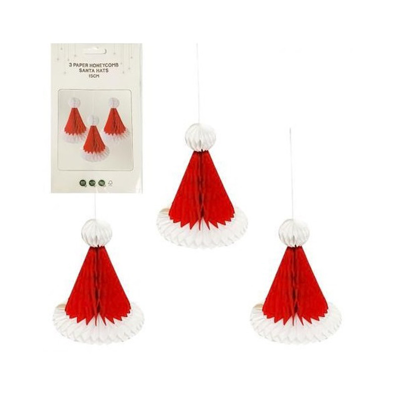 Набір підвісних прикрас Honeycomb "Шапка Санти" складається з 3 паперових елементів висотою 15 см. Кожна прикраса виконана у формі червоно-білої шапки Санти в техніці "соти", що надає їй об’ємності та легкості.
