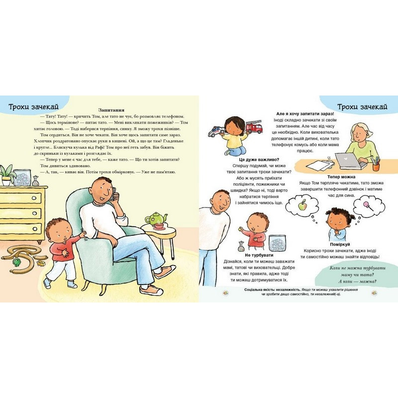 Книжка "Можу зачекати. Усе про терпіння" допоможе дитині зрозуміти, що таке терпіння і чому воно так важливе. Чому потрібно чекати своєї черги? Навіщо розвивати терплячість і як навчитися бути терплячим? Зі сторінок цього видання дитина дізнається про важливі соціальні якості, такі як гнучкість, наполегливість, самоконтроль та вміння долати труднощі.Кожен розворот містить:- повчальну міністорію;- окрему життєву ситуацію для обговорення та опрацювання;- кілька практичних порад, як діяти в подібних ситуаціях.Це унікальне видання допомагає дитині опанувати терпіння - якість, яка сприяє успіхам у навчанні, спілкуванні та повсякденному житті.
