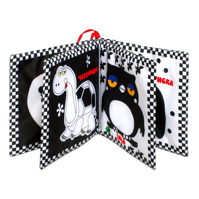 Контрастні чорно-білі зображення спеціально підібрані для розвитку зору немовлят із перших днів життя. Книжка виготовлена з м’яких, приємних на дотик матеріалів, безпечних для малюка. Вбудована пищалка привертає увагу та стимулює слух.