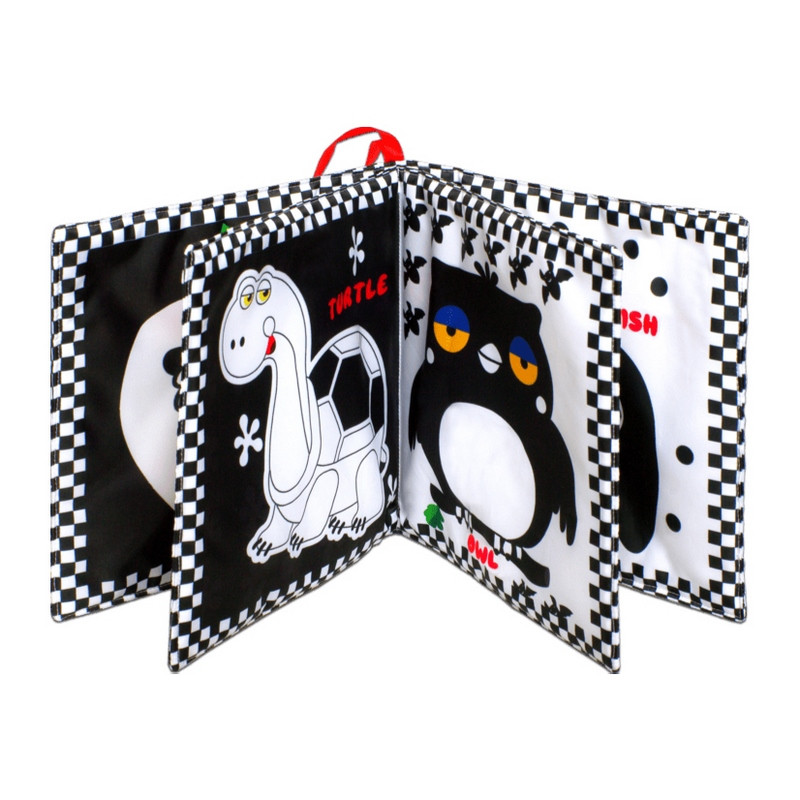 Контрастні чорно-білі зображення спеціально підібрані для розвитку зору немовлят із перших днів життя. Книжка виготовлена з м’яких, приємних на дотик матеріалів, безпечних для малюка. Вбудована пищалка привертає увагу та стимулює слух.