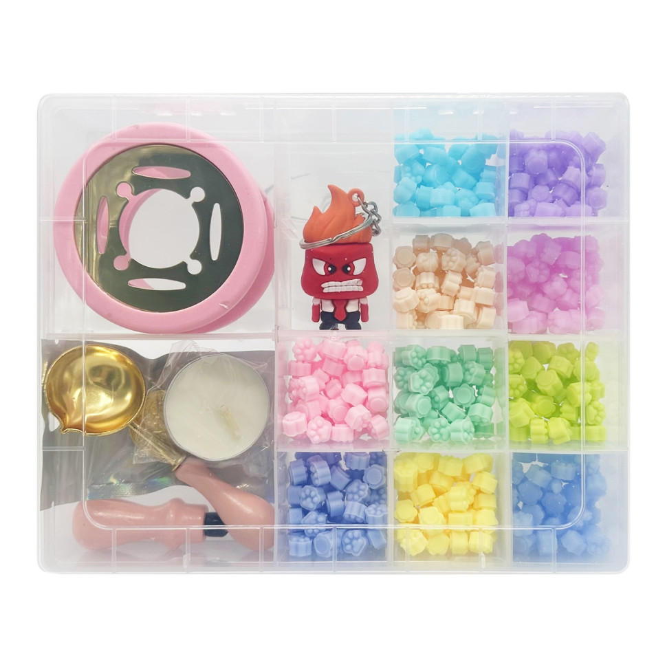 Усі елементи зручно розміщені у міцному пластиковому боксі, що забезпечує порядок, легке зберігання та комфортне транспортування. У комплект входить усе необхідне для роботи: парафінова свічка для нагрівання, ложечка для плавлення воску, підставка для нагрівання та металева печать з витонченими змінними насадками, які дозволяють створювати різні варіанти відбитків.