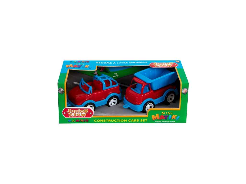 Набір дитячий “Mini Matiki ” – включає два автомобілі -позашляховик та вантажівку, виконані в яскравих кольорах. Комплект призначений для дітей віком від 3 років, він ідеально підійде для маленьких будівельників, зацікавлених у пізнавальній та активній грі.