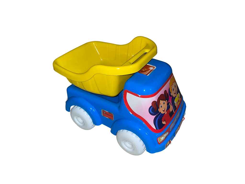 Іграшка дитяча “Машинка самоскид №1 діти” – це яскрава кольорова вантажівка з червоними колесами та відкидним кузовом. На кабіні вантажівки намальовано персонажів, які посміхаються.