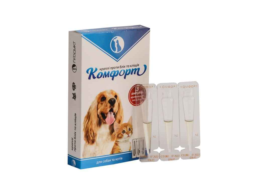 Краплі інсекто-акарицидні Коти, собаки Комфорт проти бліх та кліщів 3 ампули по 0,5мл ТМПродукт