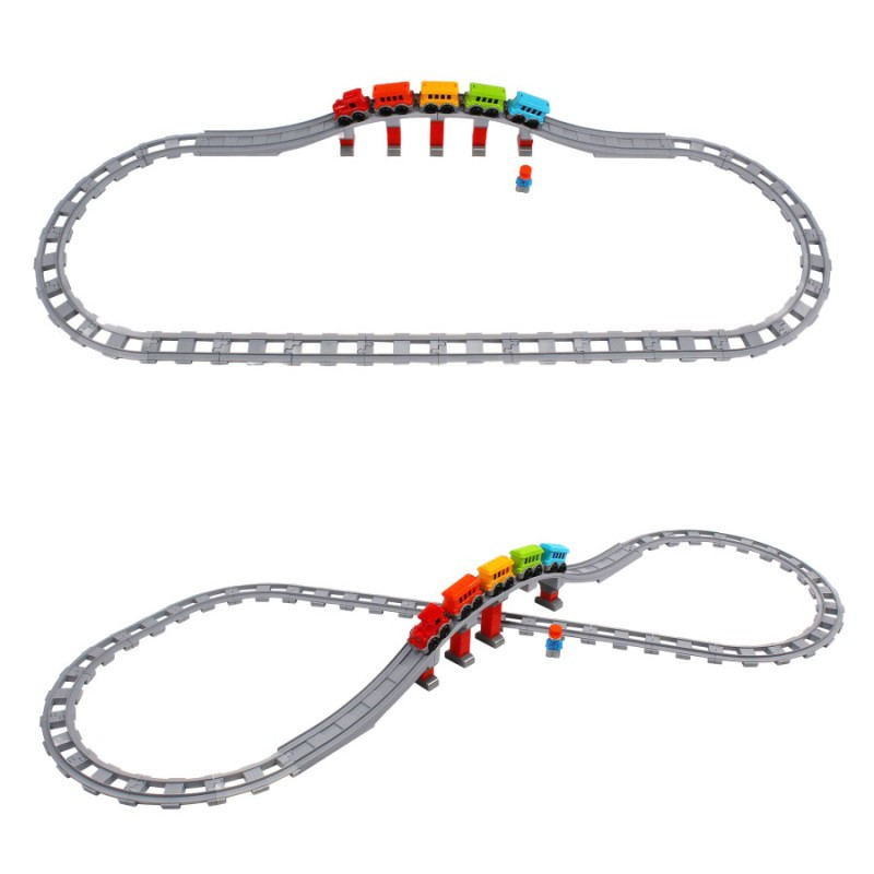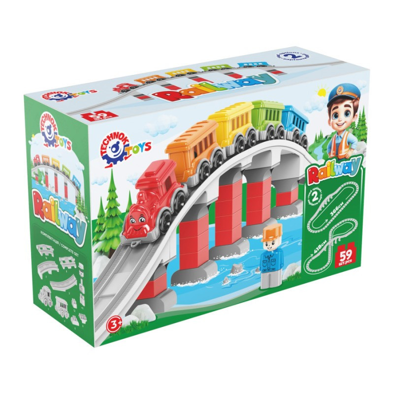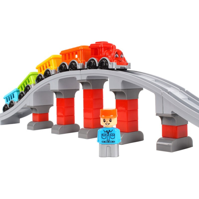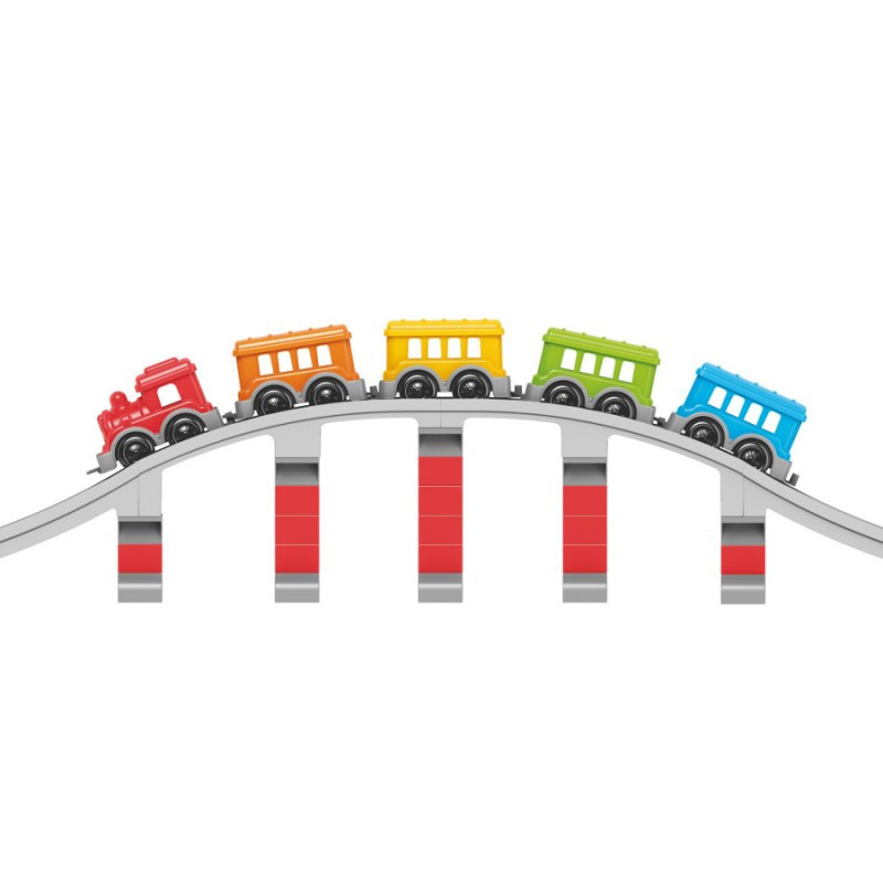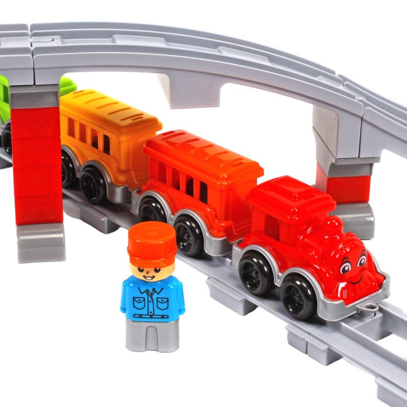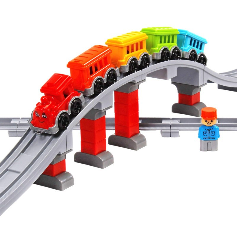 Ваш малюк буде в захваті, збираючи власну залізницю з яскравим поїздом, що складається з локомотива з доброзичливою посмішкою та чотирьох різнокольорових вагонів.Безмежні можливості для гри: Набір включає 16 прямих, 8 вигнутих та 2 довгі дуги елементів колії, що дозволяють створити залізничне полотно довжиною до 386 см, а при бажанні і до вражаючих 438 см! Додайте сюди величний міст з опорами - і ось ваша власна залізнична мережа готова до подорожей!Розвиток та навчання через гру:Збирання конструктора не тільки розважає, а й ефективно розвиває дрібну моторику рук, логічне та просторове мислення, уяву та креативність. Ваша дитина навчиться послідовно мислити, планувати та втілювати свої ідеї.Яскраві кольори та якість:Іграшка виготовлена з високоякісного пластику, який приємний на дотик і стійкий до пошкоджень. Яскраві кольори, а особливо усміхнений паровозик, привертають увагу та стимулюють зорове сприйняття.Сюжетні ігри та додаткові можливості:У комплекті ви знайдете веселу фігурку залізничника, яка додасть реалістичності ігровому процесу та дозволить дитині придумувати безліч захоплюючих сюжетів.