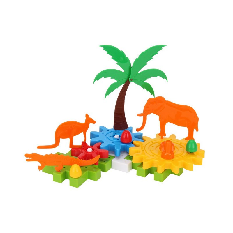 Конструктор з шестернями дарує дітям подвійну радість. 118 яскравих деталей з якісної пластмаси значно урізноманітнять процес складання конструктора та захопливі ігри з ним. Після того, як дитина об’єднає шестерні, пластини-пазли, фігурки звірів, пальми та інші елементи конструктора, вона отримає захопливу конструкцію, якою дуже цікаво гратися.Цей конструктор є не тільки цікавим, а й корисним: прокручуючи шестерні, дитина змушує рухатися іграшкових звірів і вивчає при цьому окремі фізичні явища та закони механіки. Крім того, іграшка знайомить дітей із фауною та флорою: фігурки слона, верблюда, мавпи, крокодила, лева та кенгуру входять до комплекту конструктора.Всі деталі конструктора виготовлені з якісної пластмаси та без запаху. Такий варіант пакування чудовий вибір для подарунка.
