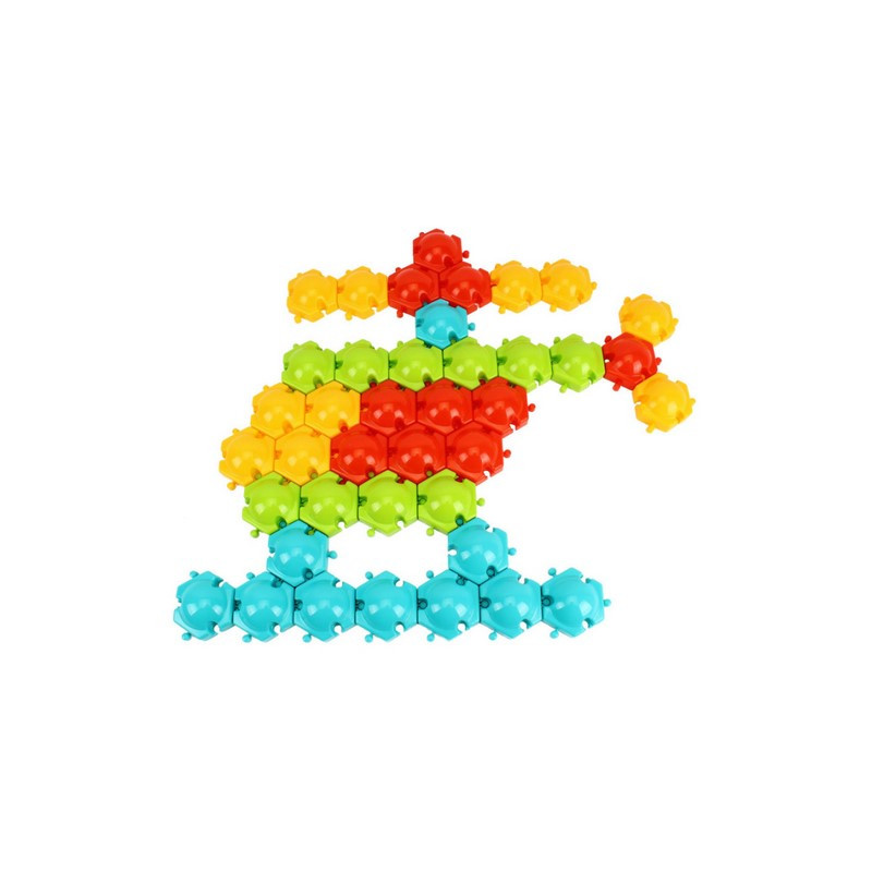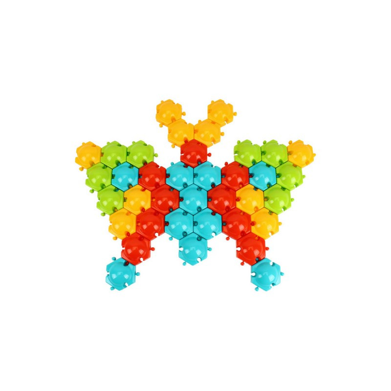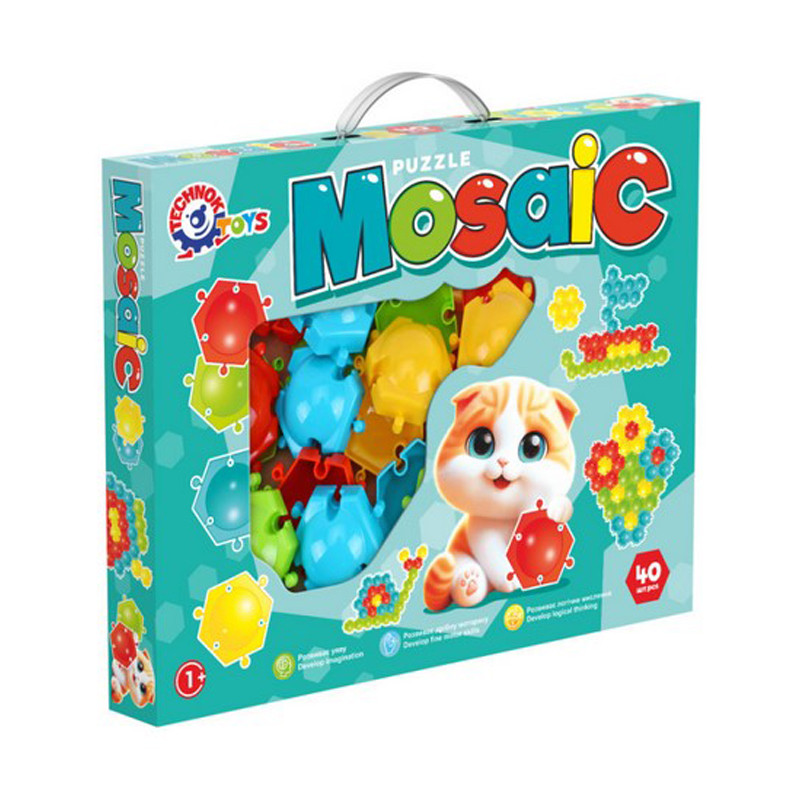 Мозаїка-пазли - це розвиваюча іграшка, що гармонійно поєднує в собі елементи класичної мозаїки, конструктора та пазлів. Вона спеціально розроблена для стимулювання ключових навичок у дітей раннього віку, починаючи вже від 1 року.Набір складається з 40 великих, зручних для дитячої ручки шестикутних елементів яскравих кольорів (чотири кольори). Розмір кожної фішки - 60 мм, що є безпечним для малюків і комфортним для збирання. Завдяки унікальній формі та системі з'єднання, ці деталі дозволяють дитині створювати необмежену кількість візерунків, форм та фігурок, розвиваючи при цьому уяву, просторове мислення та художній смак.Гра з мозаїкою-пазлами відмінно тренує дрібну моторику пальців та координацію рухів, що є надзвичайно важливим для розвитку дитини та підготовки руки до письма. Яскраві кольори деталей сприяють вивченню основних кольорів, а процес з'єднання елементів навчає логічному мисленню та вмінню знаходити рішення.