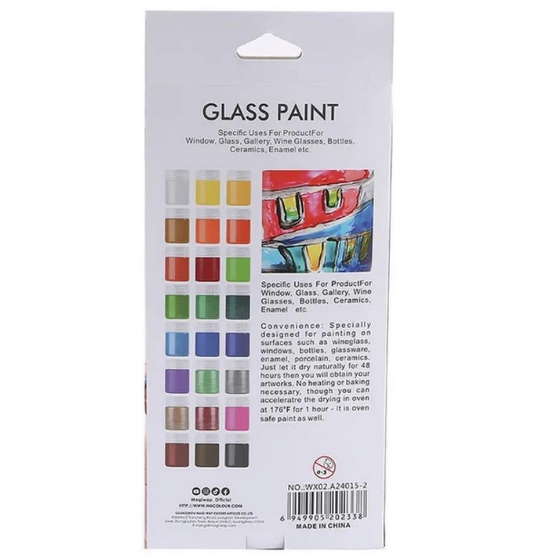 Набір фарб для скла допомагає перетворювати прозорі поверхні на справжні шедеври, викликаючи відчуття радості та творчого натхнення.Яскраві кольори легко наносяться на скло, дзеркала чи прозорі пластикові поверхні, дозволяючи створювати святкові композиції, декоративні панно та оригінальні подарунки. Завдяки пензликам у комплекті відтінки можна змішувати або малювати точні деталі.Характеристики:- Кількість кольорів: 24- Об’єм фарби: 15 мл- У комплекті: 3 пензлики- Призначення: для скла, дзеркал, прозорих поверхонь.
