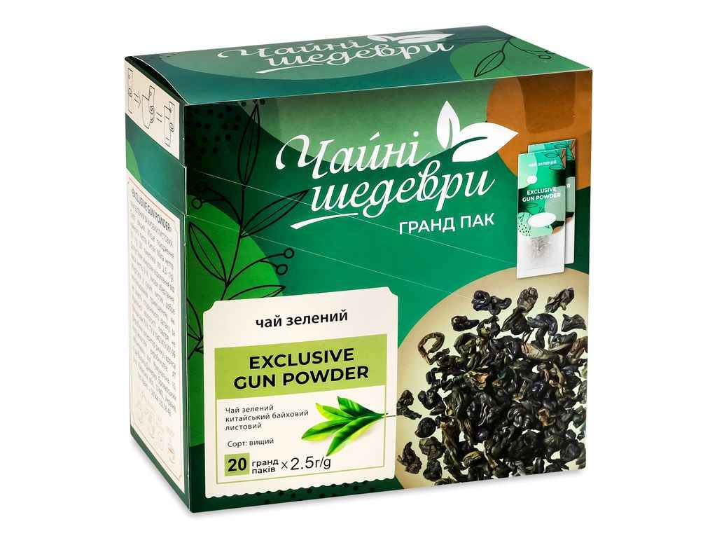 Чай зелений Чайні Шедеври Exclusive Gun powder байховий листовий вищий сорт 2.5 г х 20 шт (4823115405807)