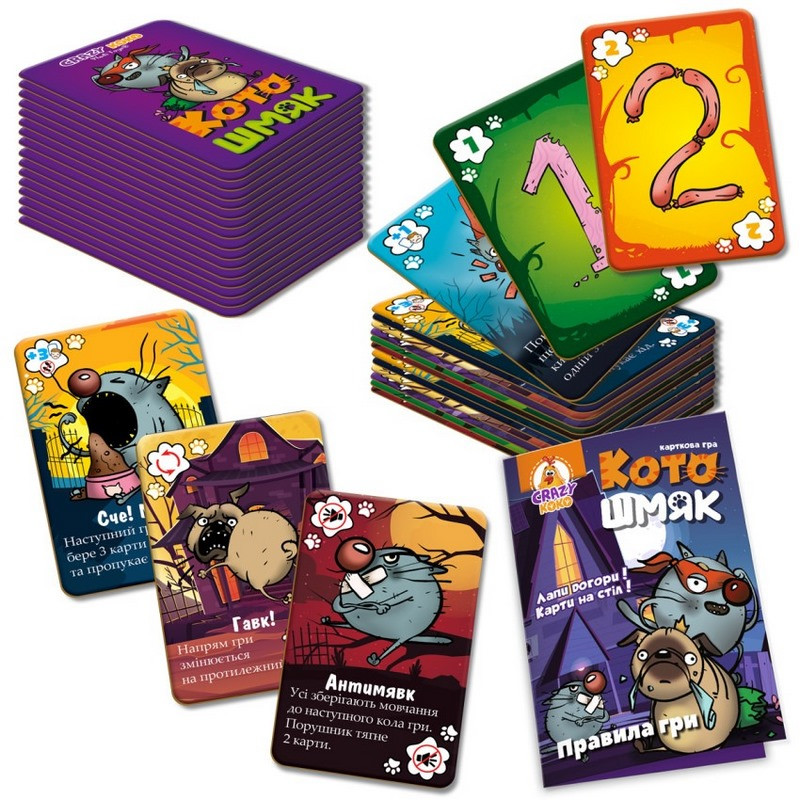 Лапи догори! - Карти на стіл! "Котошмяк" - це динамічна карткова гра, яка миттєво захоплює і дітей, і дорослих. Ідеальний вибір для сімейних вечорів, дружніх зустрічей або поїздок - компактний формат зручно брати з собою куди завгодно.Гра змушує бути уважним і швидким: рахувати, реагувати, сміятися та не втрачати концентрацію. Кожна партія проходить по-новому, тому інтерес не зникає навіть після багатьох ігор.Чим вона зачіпає?Викликає азарт і живі емоції у всіх гравців.Тренує увагу, швидкість реакції та мислення.Підходить для компанії від 2 до 6 осіб.Проста у правилах, але захоплива в процесі.Комплектація:- 100 карток (64 картки з числами від 0 до 7, 36 карток дії)- правила гри;Вік: 8-99 років."Котошмяк" - саме та гра, яку хочеться дістати на стіл ще раз і сказати: "Давай зіграємо ще одну партію".