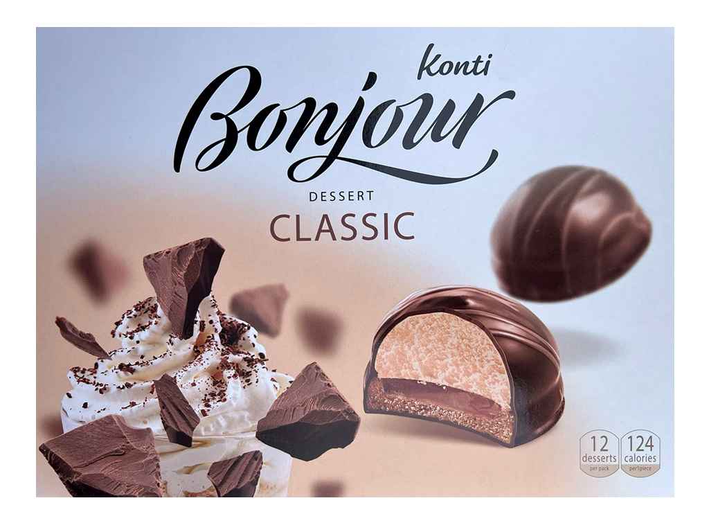 Konti Bonjour Classic (Конті Бонжур Класік) — это популярный глазированный десерт-конфета от производителя Konti, состоящий из трех слоев: хрустящего сахарного печенья в основании, мягкой карамели со сливками и кофе, а также нежного суфле со вкусом капучино, покрытый молочной шоколадной глазурью. Он имеет куполообразную форму, порционный, часто продается в индивидуальной упаковке и отлично подходит к чаю или кофе, предлагая гармоничное сочетание вкусов и текстур.