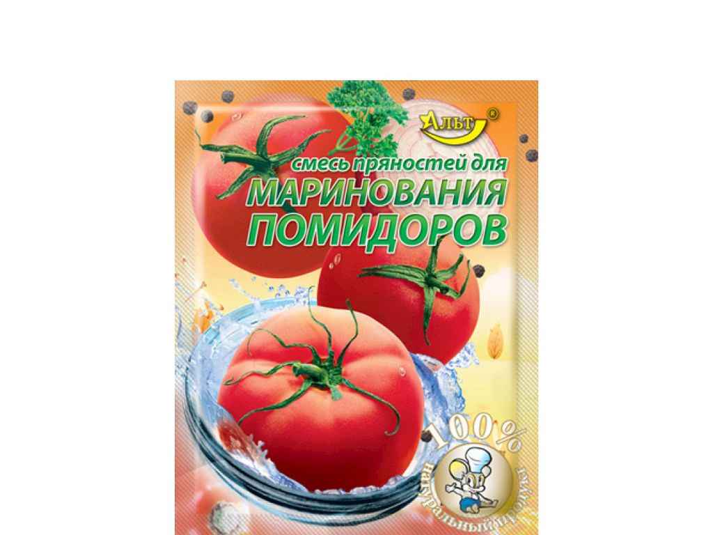 Приготування маринаду: на 3-літрову банку помідорів - 2 столові ложки солі, 2 столові ложки цукру, 2 столові ложки оцту (9%) або 1 чайна ложка лимонної кислоти. Вміст пакету розрахований на 9 л маринаду. Співвідношення спецій та маринаду можна змінювати.