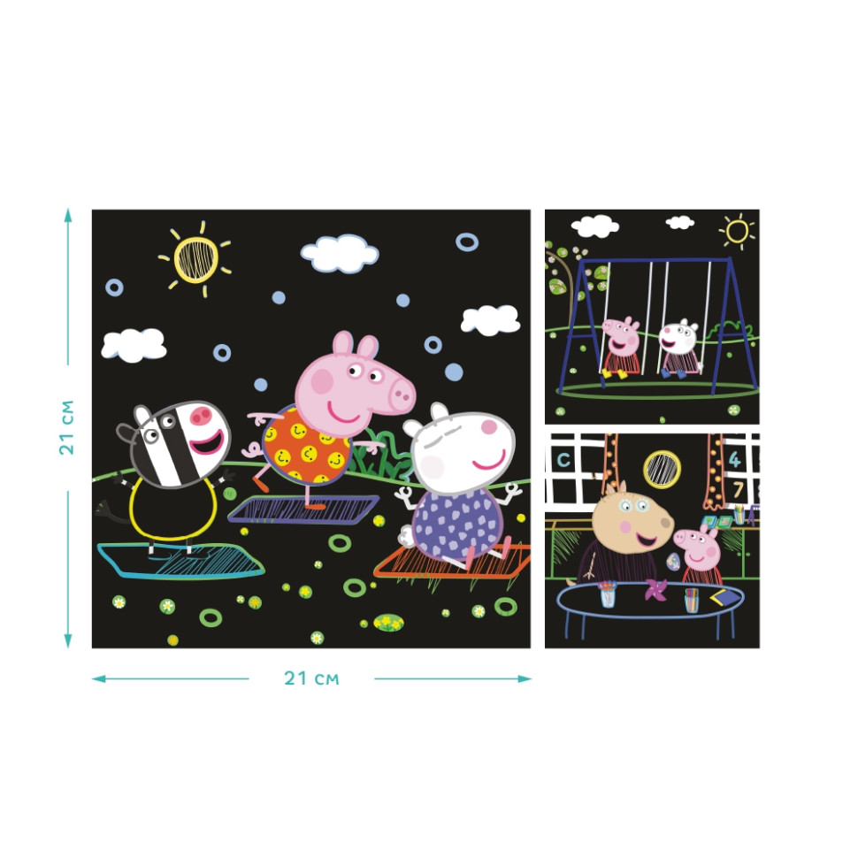Проведемо вихідні разом із Пеппою та набором гравюр. Свинка повідає малятам про те, як проводить вихідні разом із родиною та друзями аж на трьох картках-гравюрах. Дітки пірнуть в атмосферу пізнавального світу Пеппи та творчості. Гравюра вимагає точних та сміливих в рухів штихелем, уваги та зосередженості. А також стане чудовим об'єктом для прояву творчості вашого малюка.