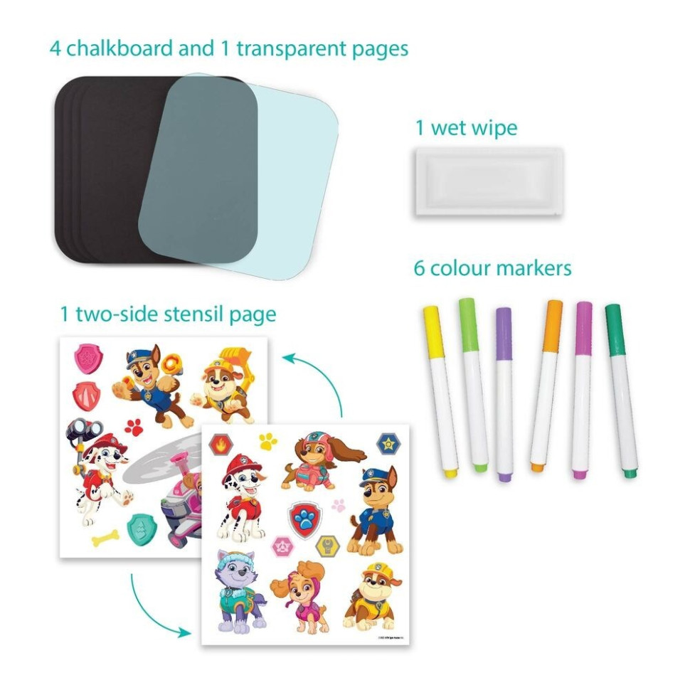 Дорожній набір для малювання DoDo “Paw Patrol” — ідеальний комплект для творчості у дорозі, у машині чи на прогулянці. Візьми всі необхідні матеріали з собою, малюй, витирай і починай заново!До набору входять:4 крейдові сторінки1 сторінка-трафарет1 прозора сторінка1 волога серветка6 кольорових маркерівпапка для зберігання (20,5 × 1,6 × 19,5 см)