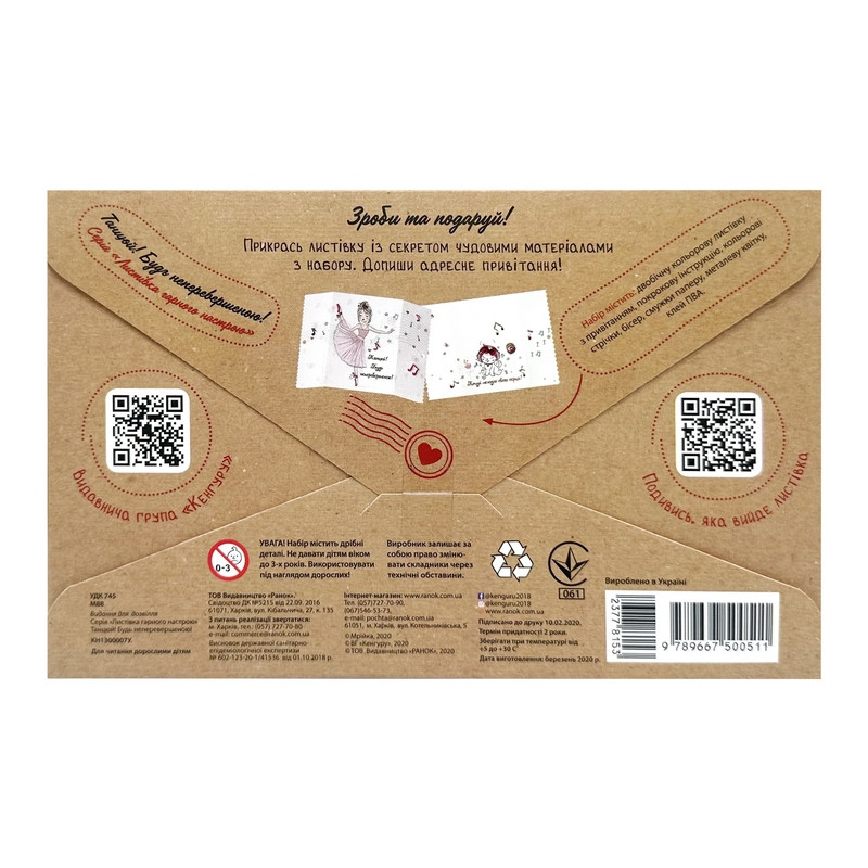 Набір для створення листівки дає можливість зробити особливе привітання власноруч. Це не просто листівка, а маленький секрет із сюрпризом, який приємно створювати й ще приємніше дарувати.У наборі зібрані матеріали для декору, з якими листівка набуває індивідуальність. Дитина може прикрасити її на свій смак і дописати адресне привітання, вкладаючи теплі слова та емоції.На зворотному боці розміщений QR-код, за яким можна подивитися приклад готової листівки та надихнутися ідеєю оформлення.