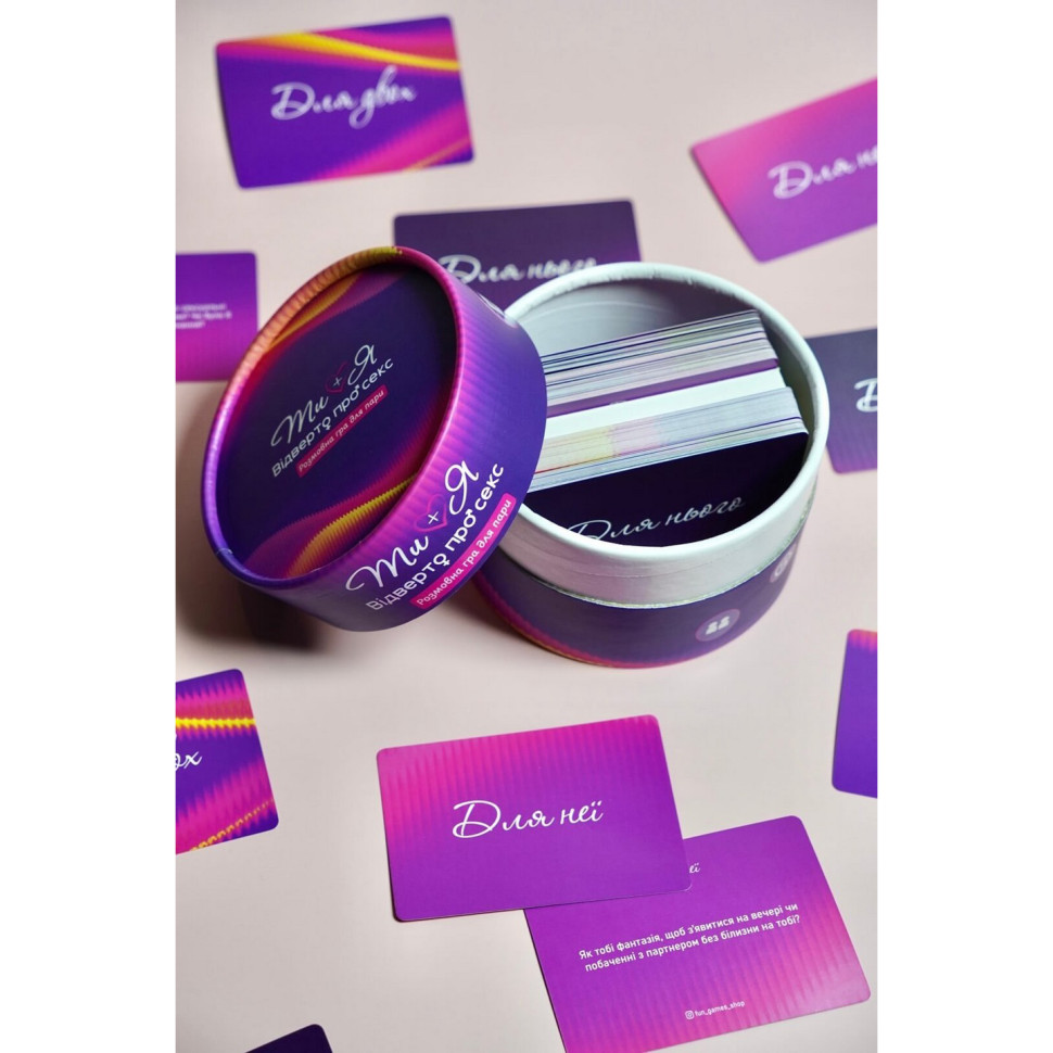 "Ти+Я: Відверто про секс" – це розмовна гра, розроблена у співпраці з сексологом, що стане в пригоді як парам, які вже давно разом, так і тим, хто лише починає будувати близькість. У будь-якому випадку на вас чекають приємні відкриття. Гра створює безпечну атмосферу, де можна сміливо ділитися найінтимнішим, тим, що справді хвилює, вабить і запалює — і бути почутим без осуду.