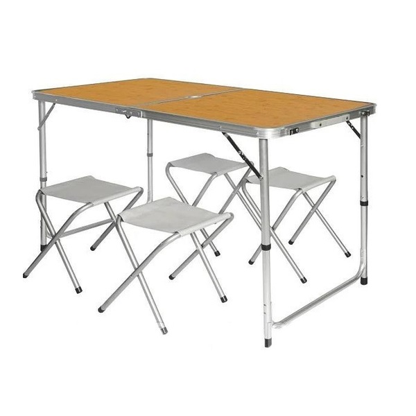 Ніжки з трубок посиленого алюмінієвого сплаву надійно тримають його на будь-якій нерівній поверхні. Особливості продукту: -Великий розмір; -Міцний каркас та стільниця; -Регулюється по висоті у двох режимах Характеристики: -Розміри в розкладеному стані: 120 х 60 х 70/55 см -Розміри у складеному стані: 60 х 60 х 6,5 см -Матеріал столу: матовий МДФ, завтовшки 5 мм -Каркас: алюмінієві трубки -Вага: 6 кг -Припустиме навантаження: 30 кг Комплектація: -стіл розкладний у вигляді дипломата -4 табурети Цей розкладний стіл ідеально підійде: -для виїзду на природу/пікників; -для риболовлі (організація кухні тощо); -для кемпінгового відпочинку на морі тощо; -як садові меблі на дачі.