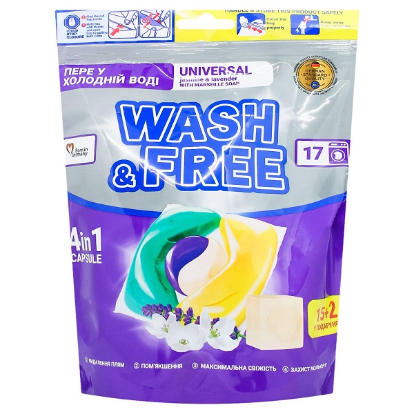 Капсули для прання "Жасмин та лаванда з марсельським милом" 15+2 шт. WASH & FREE
