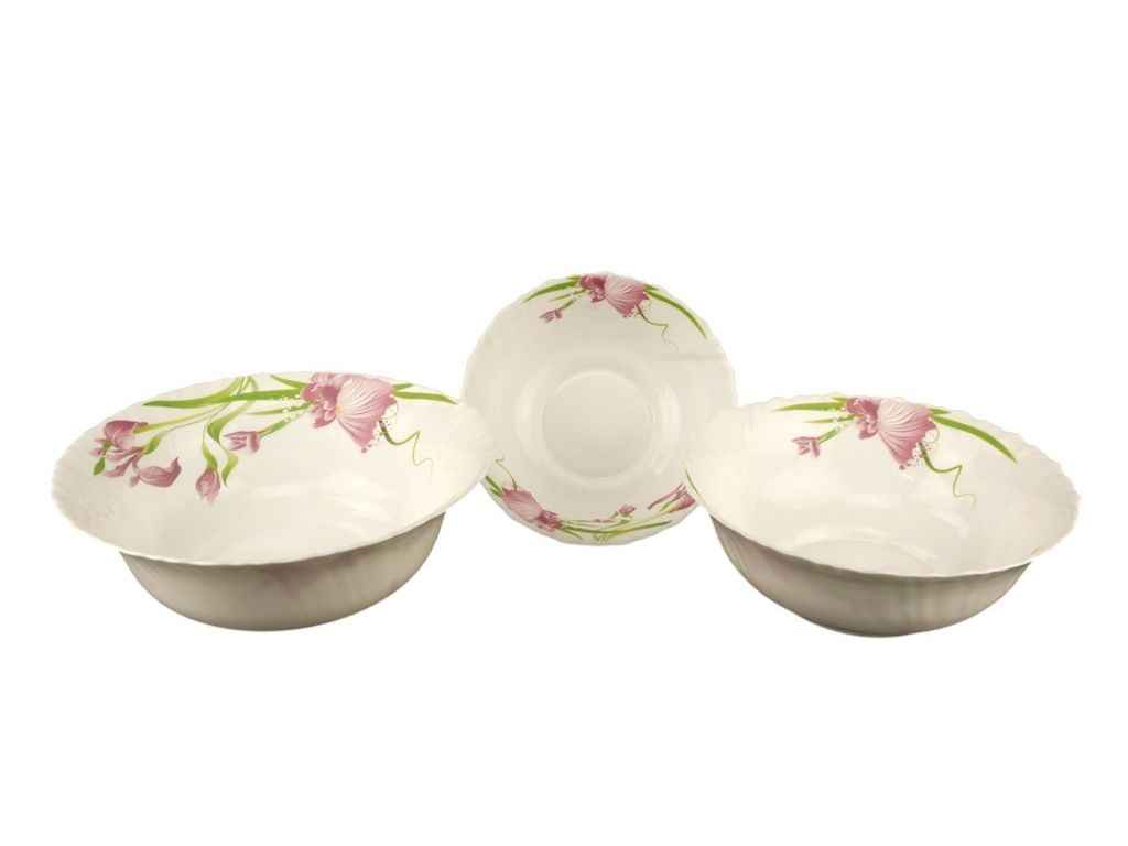 Набір салатниць виконаний зі склокераміки і прикрашений ніжним малюнком. Набір складається з 3 салатниць. Оригінальність оформлення виробів припаде до смаку цінителям класики. Такий набір послужить відмінним подарунком до будь-якого свята, а також додасть елегантності і затишку будь-якого святкового столу! Посуд має гладку непористій поверхнею , не вбирає запахи, легко миється. Підходить для миття в посудомийній машині.