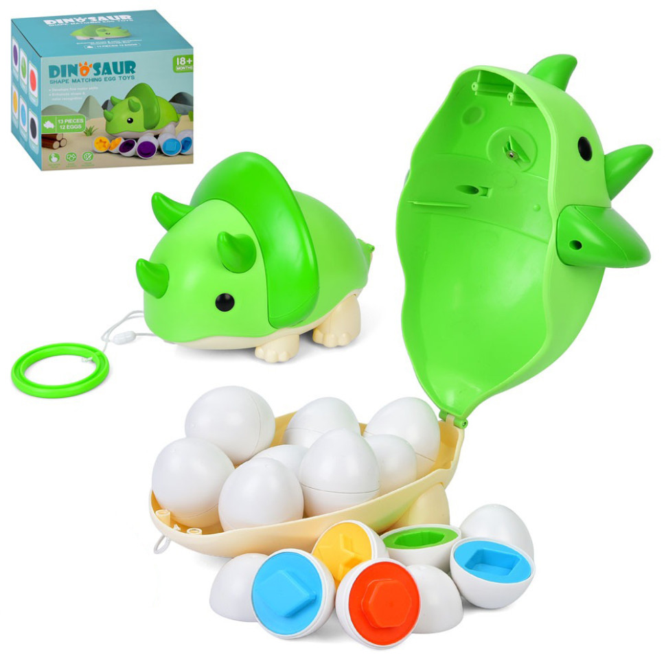 Набір "Яйця-пазли" (12 штук): Всередині динозавра або окремо зберігаються 12 незвичайних яєць. Кожне яйце розділяється на дві частини, які з’єднуються за принципом сортера (різні форми та кольори серцевини).