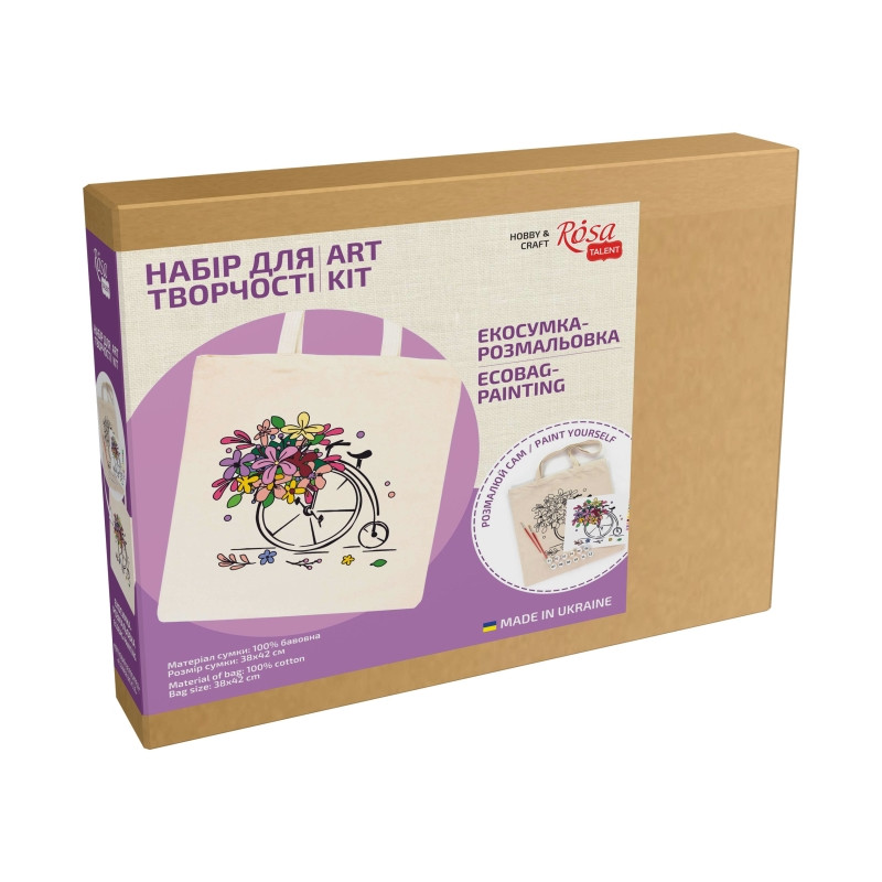Набір для творчості Rosa Talent Екосумка-розмальовка Квітковий велосипед - це чудове рішення для тих, хто дбає про навколишнє середовище, прагне забезпечити себе комфортом під час прогулянки чи шопінгу та залишатися у тренді.Екосумка ROSA Talent - виготовлена зі 100% бавовняної тканини. Щільний якісний матеріал та надійна фіксація ручок дозволяє витримувати навантаження вагою до 15 кг.Вміст набору:- екосумка з нанесеним контуром малюнку;- фарби акрилові для тканин;- пензлі художні;- кольорова схема;- прозорий пакет;- етикетка з покроковою інструкцією на звороті.Розпис екосумки надзвичайно захоплюючий та водночас легкий процес, адже контури малюнку вже нанесені на основу.Розписана власноруч сумка стане яскравим стильним та практичним аксесуаром, що доповнить щоденний образ!Розмір сумки: 38х42 см.Розмір ручок: 60х3 см.