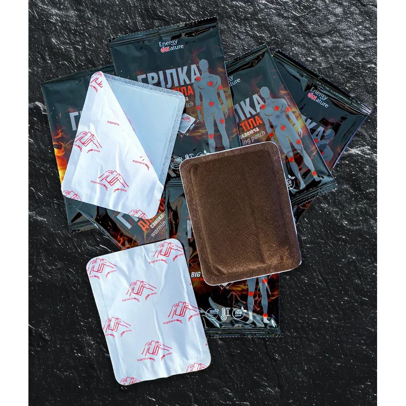 Самонагрівна грілка для тіла BIG size (самоклеюча) – надійний і ефективний спосіб забезпечити комфорт та захист від переохолодження в умовах низьких температур. Також відома як наклейка-грілка, термонаклейка, термопластир або heat patch.Основні характеристики грілки:Розмір грілки 10х13см.Нагрівається від 40° до 55°Віддає тепло до 16 годинВ упаковці 1шт.Склад грілок: залізний порошок, сіль, активоване вугілля, вода, вермикуліт.Принцип дії грілки - при контакті з повітрям, відбувається екзотермічна реакція: окислення пудри заліза, при якому виділяється велика кількість тепла.Спосіб застосування грілки:відкрити зовнішній пакет;дістати грілку та тримати на повітрі протягом 1-3хв. для активації;для швидкої реакції – струсити;зніміть захисну плівку та прикріпіть грілку липкою стороною до одягу;після використання утилізуйте грілку як побутове сміття.Під час роботи грілки відсутні будь-які випари шкідливих речовинЗАСТЕРЕЖЕННЯ: не прикріплюйте безпосередньо на шкіру. Максимальна температура 65°С може бути відчутно гарячою і при надмірному використанні може спричинити точкові опіки та подразнення шкіри. Не є медичним виробом.Не використовуйте на: набряклій, пораненій, обмороженій або чутливій шкірі чи відкритих ураженнях шкіри.