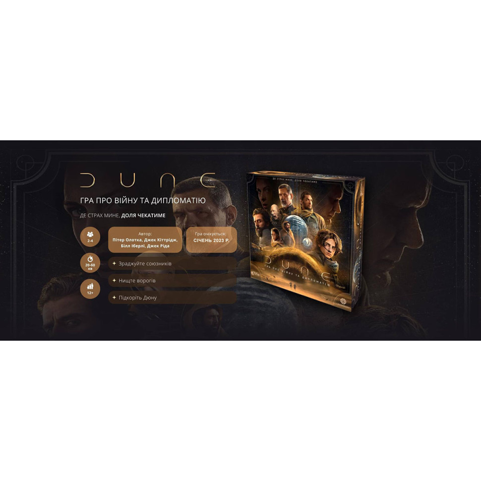 Дюна — сама назва натякає на безлюддя. Піщана пустка — єдиний краєвид на більшості планетної поверхні, помережаний лише скелястими хребтами. Велетенські хробаки пів кілометра завдовжки живуть у піску, нападаючи на будь-кого, хто там затримується. Людство тулиться до ізольованих осередків життя, де доступна дорогоцінна вода — але навіть ці поселення потерпають від жахних коріолісових бур. Та все ж ця планета визначає долю цілої галактичної імперії. Адже тільки на Дюні можна збирати прянощі. Прянощі — ключ до міжзоряних мандрівок. Також вони — медичний препарат, що значно продовжує життя.Могутні сили зійшлися в боротьбі за Дюну. Імперські війська, шляхетні роди і кочові тубільці-фримени змагаються за владу над планетою. У цій грі ви візьмете на себе роль однієї зі сторін конфлікту: Атрідів, Фрименів, Харконненів або Імперії.МЕТА ГРИМета гри полягає в тому, щоб здобути контроль над Дюною, використовуючи унікальні здібності своєї фракції: захопити три твердині в кінці 3-го, 4-го чи 5-го ходів або мати найбільше очок за твердині й прянощі в кінці 5-го ходу.У цій стратегічній настільній грі учасники можуть стати частиною дому Атрейдес, відомого своєю тягою до справедливості і поміркованості, примкнути до жорстоких і нещадних Харконненів, долучитися до жадібного Імперіуму або очолити непокірних Фрименів. Мета кожної фракції — захопити планету Дюна.ХІД ГРИПротистояння триватиме 5 раундів. Кожен раунд складається з семи фаз. У фазі піщаної бурі гравці кидають кубик, що визначає рух бурі, яка несе загибель всім, хто опиниться з нею в одній локації. У фазі появи прянощів гравці розкривають картку відповідної колоди і розміщують прянощі у зазначених локаціях. Черви знищують прянощі і загони.У фазі отримання карток гравці оплачують прянощами картки бою і торгівлі. У фазі відродження можна відроджувати загиблі загони. Далі відбувається фаза висадки розміщення загонів. У фазі бою гравці розігрують відповідні карти, борючись за локації і цитаделі. У фазі збирання прянощів ваші загони отримують 2 прянощі, якщо перебувають у локаціях із цим ресурсом.Якщо після 3, 4 або 5 раунду ви зуміли захопити 3 цитаделі, то перемагаєте. Якщо після закінчення п'ятого раунду ніхто не має потрібної кількості цитаделей, то гравці отримують очки за підконтрольні об'єкти і визначають переможця.