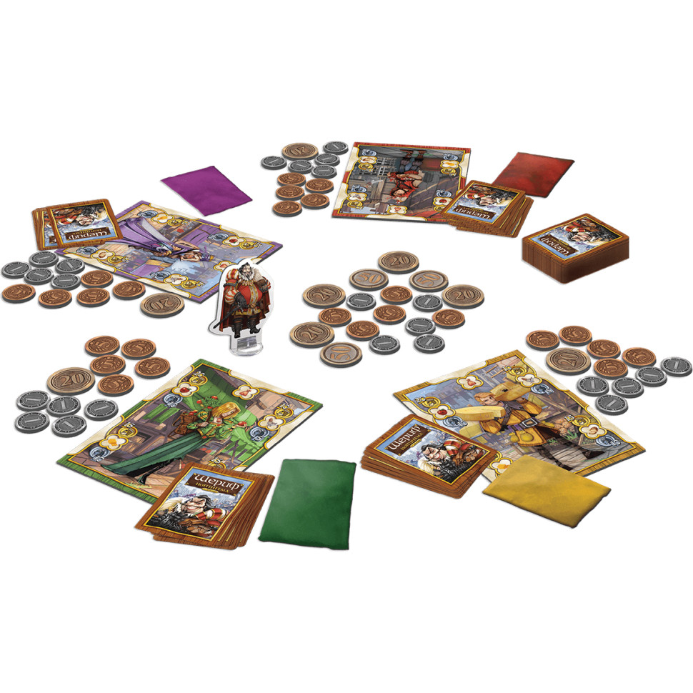 Найкраща гра на блефВесела компанійська гра, споріднена картковій грі «Вірю-не-вірю». Це захоплююча гра на блеф, мабуть, найкраща в своєму роді. Гра була розроблена в 2014 році й отримала вже друге видання з переробленим артом. У ньому на вас чекають оновлені правила та нові компоненти: шостий торговець, карти чорного ринку та помічники шерифа. Над її створенням працювали автори, відомі по проектам «Склад 51» і «Війни магів». Гра ставала номінантом конкурсів «Golden Geek-2014» (краща гра року, краща паті-гра, найкраща карткова гра і найкраща сімейна гра), «Origins Awards--2015» і «SXSW Gaming Awards-2015». У 2015 році «Шериф Ноттінгема» взяв головну премію на конкурсі «Boardgames Australia Awards». На даний момент гра займає 19-е місце серед паті-ігор і 35-е місце в рейтингу кращих сімейних ігор світу на сайті «BoardGameGeek».Обдуріть ноттінгемського шерифаДії настільної гри «Шериф Ноттінгема» відбуваються у міських воріт, де розташувався противний товстий шериф. На жаль, Робін Гуд далеко, десь у нетрях Шервудского лісу, а крім нього обламати роги шерифу зовсім нікому. Тому бідним торговцям доведеться розраховувати тільки на свої сили. Щоб провезти в місто товари, їм доведеться викручуватися, хитрити і блефувати, а іноді і платити мзду проклятому хабарнику. Чим більше легальних і контрабандних товарів вдасться провезти і чим більше золота виторгувати, тим більше шансів на перемогу в грі. До дозволених товарів відносяться яблука, хліб, сир і кури, а до заборонених - медовуха, перець, шовк і арбалети.Вірю-не-вірюПартія ділиться на раунди, в кожному раунді роль шерифа виконує один з гравців. На початку раунду купці добирають карти з стопок скиду або з колоди, а потім кладуть у свої мішки від однієї до п'яти карт товарів. Далі гравці зустрічаються з шерифом. Кожен купець оголошує тип легального товару в своєму мішку і його кількість. Шериф повинен вирішити, розкривати або не розкривати мішок. Щоб шериф не відкривав мішок, гравці можуть пропонувати шерифу хабара - золото або карти товарів - або годувати його обіцянками. Якщо шериф повірив і пропустив купця, той розкладає провезені товари на своєму прилавку.Якщо шериф все-таки вирішив перевірити вміст мішка, можливі два варіанти розвитку подій:в мішку виявилося не те, що оголошено: товари конфіскуються і купець сплачує зазначений на них штраф;в мішку виявилося те, що оголошено: шериф платить купцеві штраф за кожен товар.Гра закінчується після того, як всі гравці двічі побувають шерифом. Щоб визначити переможця гравці підсумовують своє золото і додають до нього переможні очки за товари на прилавку - легальні і контрабандні. Той, хто набере більше переможних очок, стане переможцем.