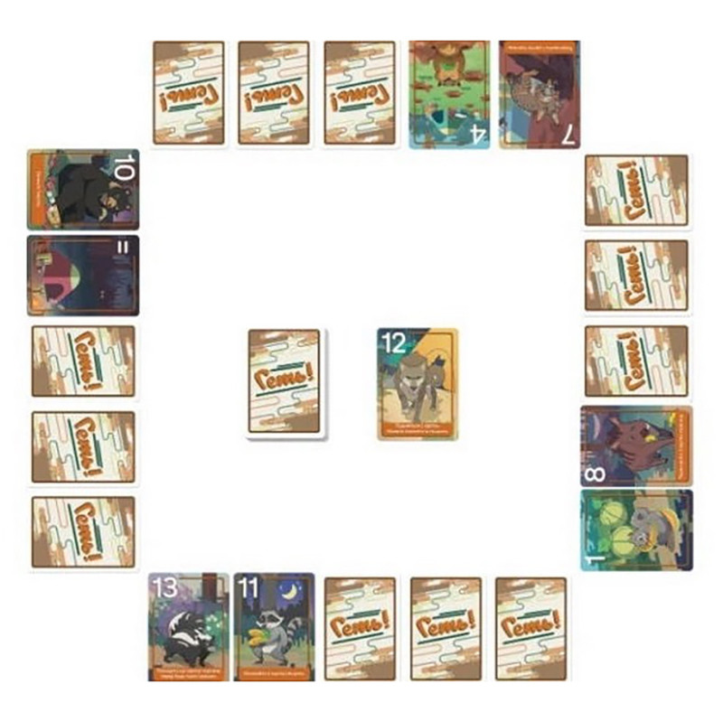 Геть! Тварини проти туристів (Scram!): Боротьба за лісовий спокій Вирушивши у лісовий похід із друзями, ви мріяли про спокійний відпочинок на природі. Але коли ви досягли місця призначення, виявили, що ваш план порушений гучною компанією та настирливими місцевими мешканцями. Вам належить одночасно вирішити обидві ці проблеми і досягти спокою. Геть! Тварини проти туристів (Scram!)– це стратегічна гра, де ви і ваші друзі поділяєтеся на команди туристів, які зіткнулися з небажаними сусідами - місцевими тваринами та іншими туристами. Ваша мета – прибрати всіх, хто заважає вашому відпочинку. Це можливо завдяки вмілому управлінню вашим табором та крику "Геть!" на адресу суперників. Кожен гравець керує своїм табором, що складається з карток тварин, розташованих перед ними. На кожній карті вказано кількість збитків, які вона може заподіяти вашому табору. У ході гри ви будете міняти карти у своєму таборі на карти з колоди, прагнучи позбутися найбільш небезпечних істот. Коли ви вважаєте, що у вас менше шкідників, ніж у суперників, можете крикнути "Геть!" та завершити раунд. Перемагає команда туристів, яка зможе зберегти найменшу шкоду від нападів тварин. Виживання у лісі: боротьба за свою територію На початку гри учасники поділяються на команди та послідовно виконують свої ходи. Варіанти дій у свій хід: 1. Добрати карту з колоди: Підніміть верхню карту з колоди, огляньте її потай і виберіть одну з таких дій: Використовуйте здатність карти, а потім скиньте її. Замініть одну з карток у таборі на вибрану, не розкриваючи її іншим членам команди. Просто скиньте вибрану картку. 2. Добрати карту зі стопки скидання: Виберіть верхню карту зі стопки скидання та замініть одну з карток у своєму таборі. 3. Вигукнути: "Геть!" суперникам: Ця дія дозволяє закінчити раунд, якщо у вашому таборі залишилося 2 або менше карт і ви вважаєте, що ваша команда поступається за набраними очками шкоди. Якщо ви вирішуєте використовувати можливість карти, ви повинні застосувати її повністю. Це може включати таємне перегляд карт, переворот карт вгору, скидання карт з табору або обмін картами між таборами. Для заміни карти з колоди або стопки скидання на карту з табору необхідно, щоб у вашому таборі або таборах ваших союзників вже були карти з тим же номером. Ви повинні викласти їх з таборів, перевернути та перевірити збіг номерів. При успішній заміні нову карту кладуть вниз, якщо вона з колоди, або вгору ногами, якщо зі стопки скидання. Помилки в цій дії караються штрафом! Гра завершується після чотирьох раундів або коли колода вичерпана. Після цього всі карти перевертаються, і підраховуються очки втрати. Картки із символом "=" дорівнюють найменшій карті в таборі. Перемагає команда з найменшим рахунком! У пошуках усамітнення: новий погляд на пригоди у лісі Геть! Тварини проти туристів (Scram!) - це забавна гра для командної гри, що поєднує прості правила, швидкий геймплей і стратегічний підхід. Придбати цю настілку варто для сімейних поєдинків та зустрічей з друзями, вона приносить безліч радісних моментів та інтриг. Завдяки різноманітним режимам та спеціальним можливостям тварин кожна партія стане унікальною пригодою. Геть! Тварини проти туристів (Scram!) - це захоплююча стратегічна настільна гра, де ви суперничаєте за найкраще місце в лісі з іншими відпочиваючими та місцевими мешканцями. Ваш